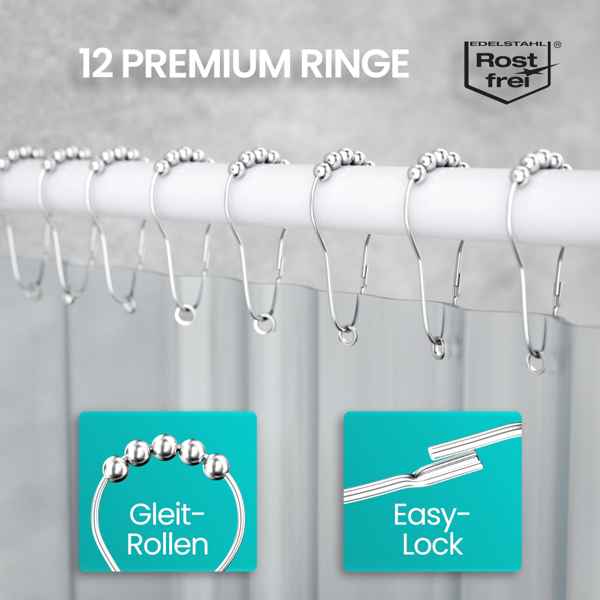 - Komplettes Set: Im Lieferumfang sind 12 passende Duschvorhangringe mit Gleitrollen enthalten, die ein müheloses Gleiten des Vorhangs ermöglichen.
