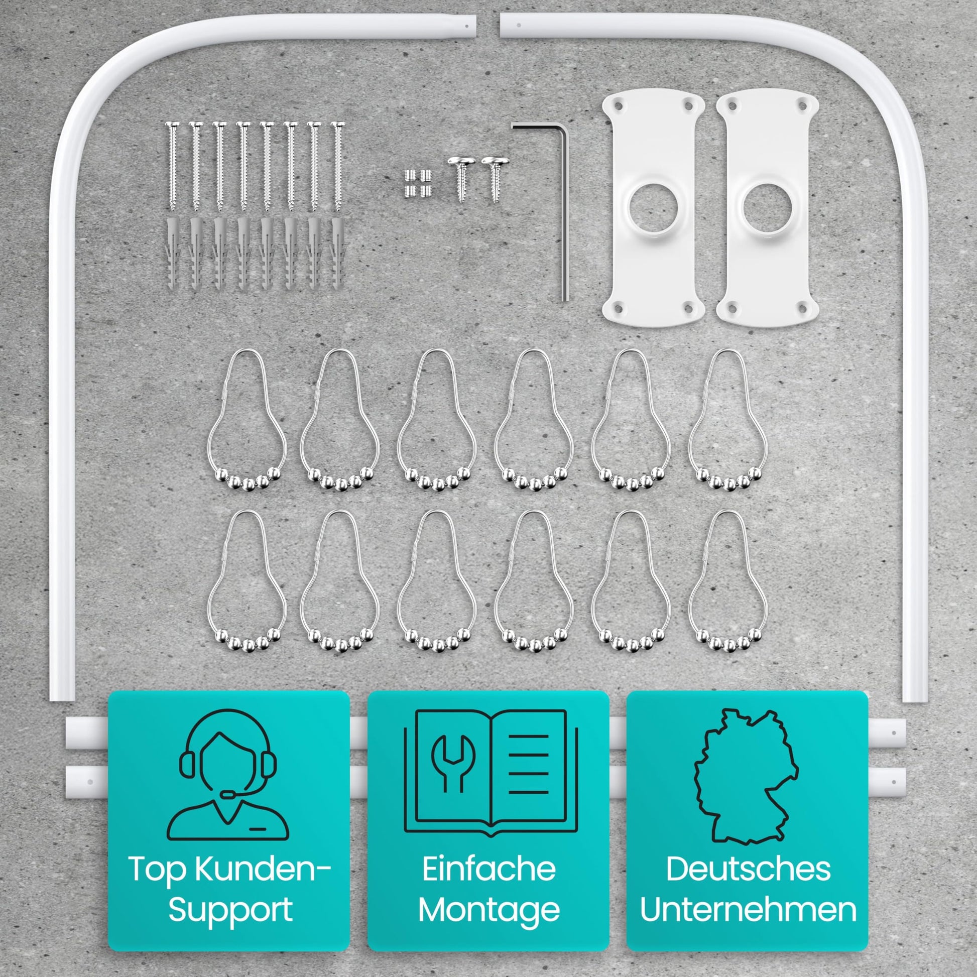 Sie erhalten ein komplettes Montageset. Neben den Stangenelementen für die flexible Montage sind auch 12 passende Duschvorhangringe mit integrierten Gleitrollen enthalten, die ein reibungsloses und leises Gleiten Ihres Duschvorhangs sicherstellen.