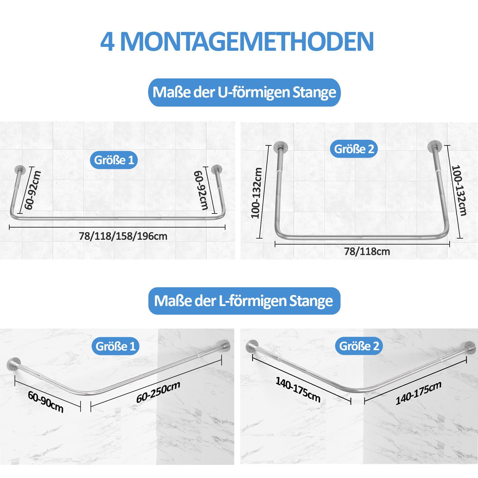 Absolut. Dank ihrer flexiblen Formgebung ist die Stange ideal für Eckbadewannen und spezielle Duschbereiche. Sie kann wahlweise als U-Form (z.B. [60-92 cm] × [78-196 cm] × [60-92 cm]) oder als L-Form (z.B. [60-90 cm] × [60-250 cm]) montiert werden, um den Bereich perfekt umschliessen.