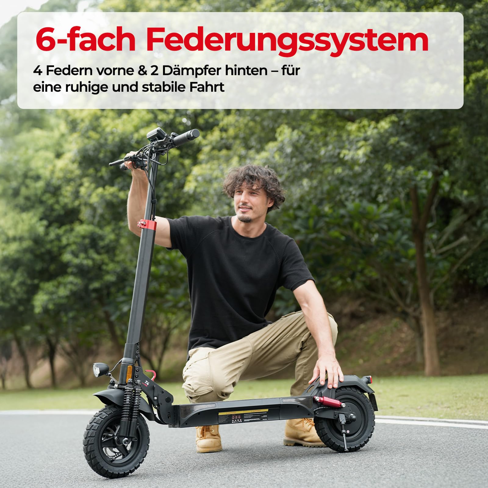 Erleben Sie ein neues Mass an Freiheit und Komfort. Das doppelte Stossdämpfungssystem an Vorder- und Hinterrad absorbiert Unebenheiten effektiv, während die grossen 10-Zoll Offroad-Reifen auf städtischen Strassen ebenso wie auf Feldwegen für exzellenten Halt sorgen. Das breite, rutschfeste Trittbrett bietet Ihnen jederzeit einen sicheren und bequemen Stand.