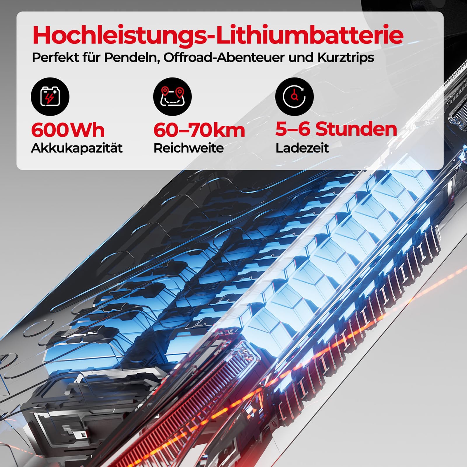 - Grosse Reichweite: 12.5 Ah Akku für Distanzen von 60 bis 70 Kilometern.