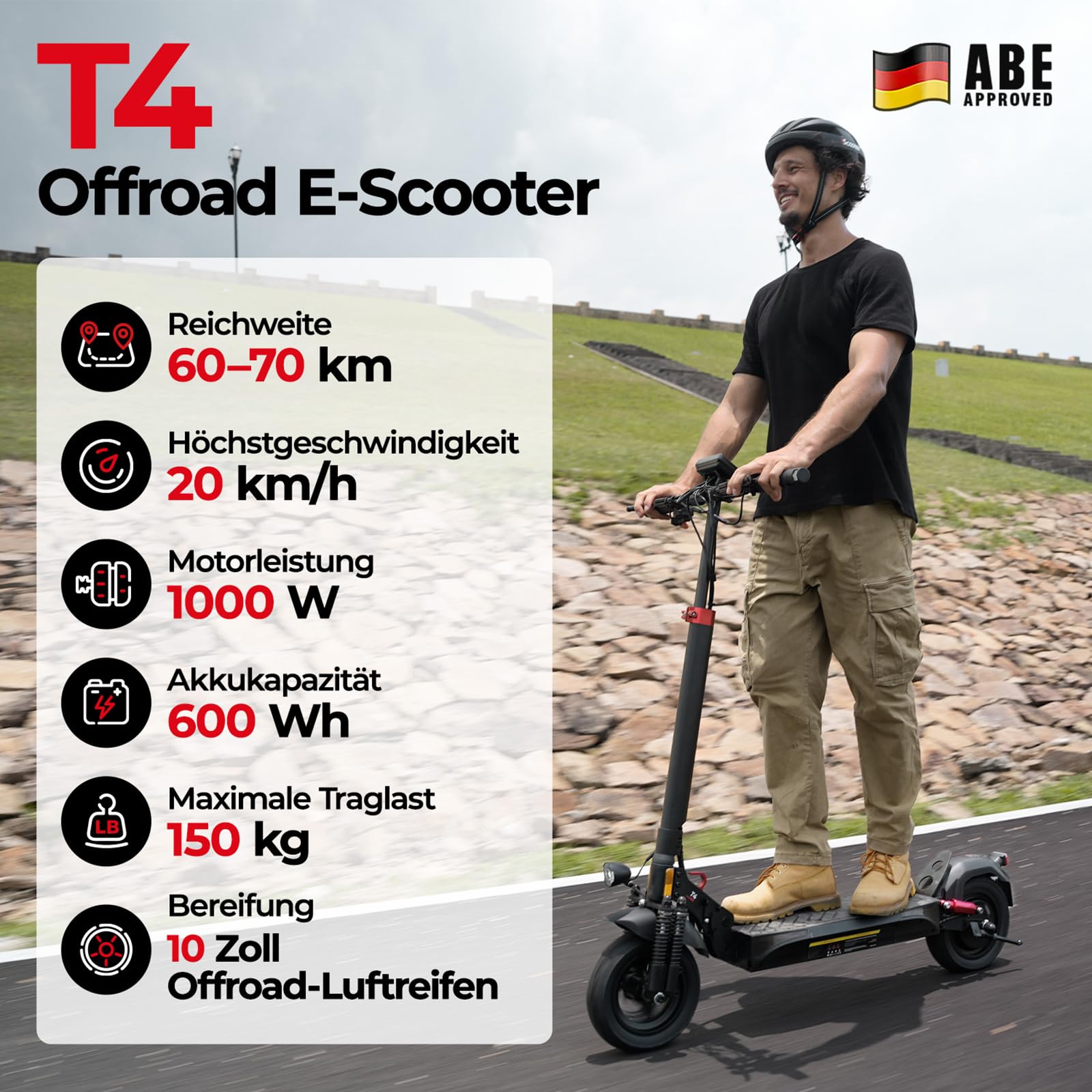 Ja, absolut. Dank seiner 10-Zoll Offroad-Luftreifen und dem doppelten Stossdämpfungssystem bietet der T4 auch auf Feldwegen hohen Fahrkomfort. Sein robuster Rahmen ist für eine maximale Belastbarkeit von bis zu 150 kg ausgelegt.