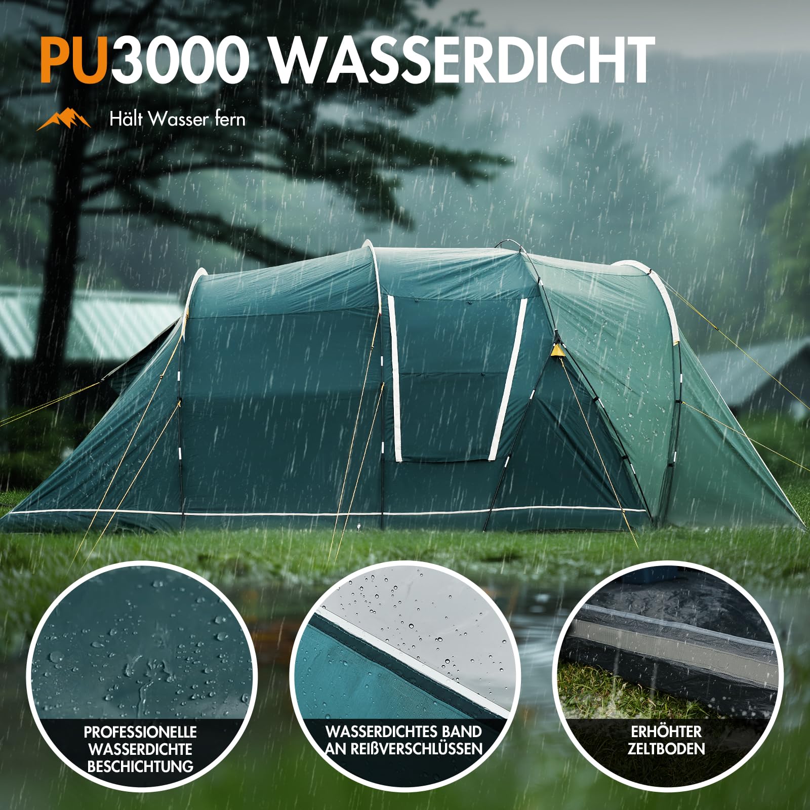 Dieses grosszügige Tunnelzelt ist die ideale Wahl für Familien oder Gruppen von 5 bis 6 Personen. Es kombiniert luxuriösen Komfort mit durchdachten Details für Ihr nächstes Camping-Abenteuer.