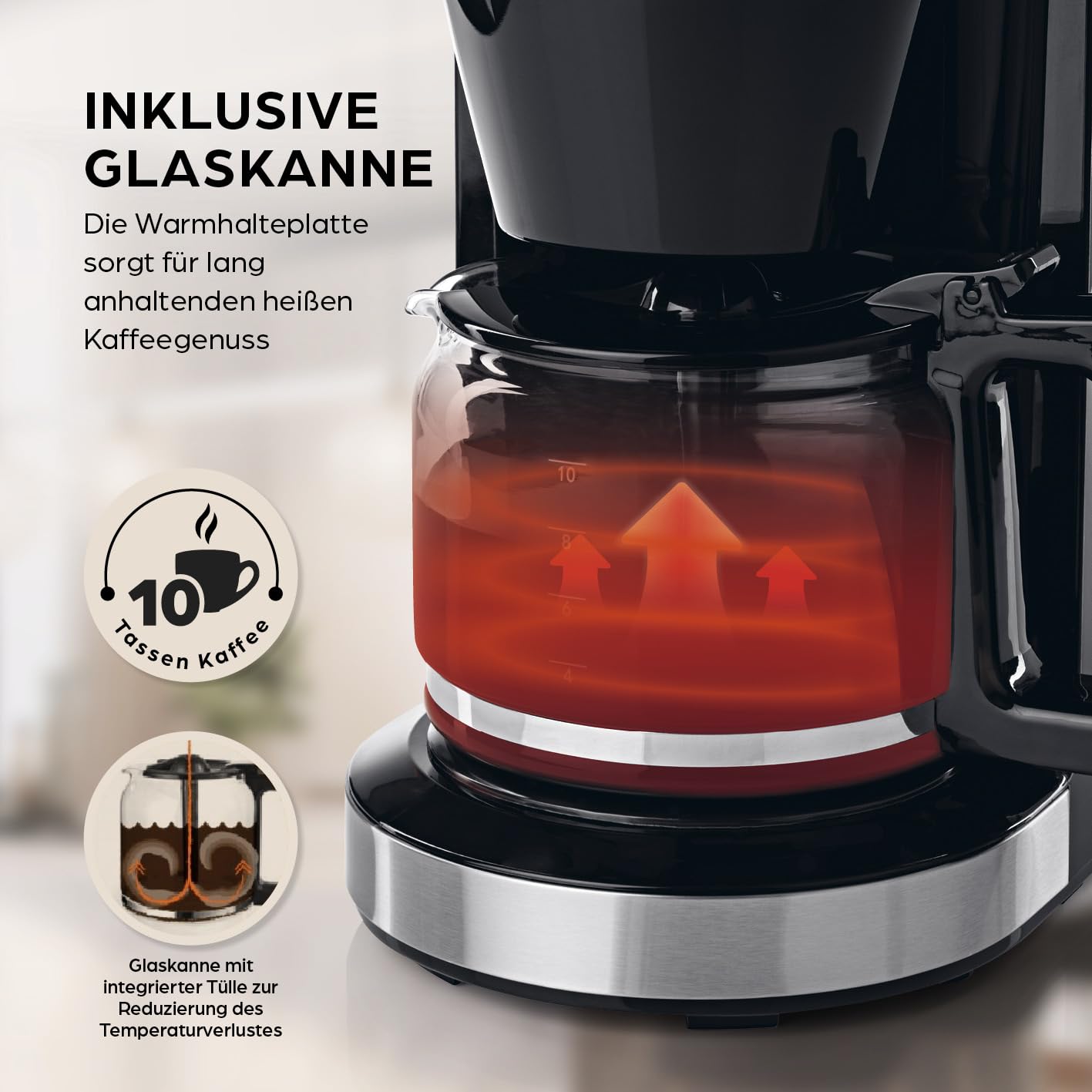 Die Kaffeemaschine hat ein Fassungsvermögen von 1,25 Litern, was für bis zu 10 Tassen Kaffee ausreicht. Für Ihre Sicherheit und zum Energiesparen schaltet sich die Maschine nach der Warmhaltephase automatisch ab.