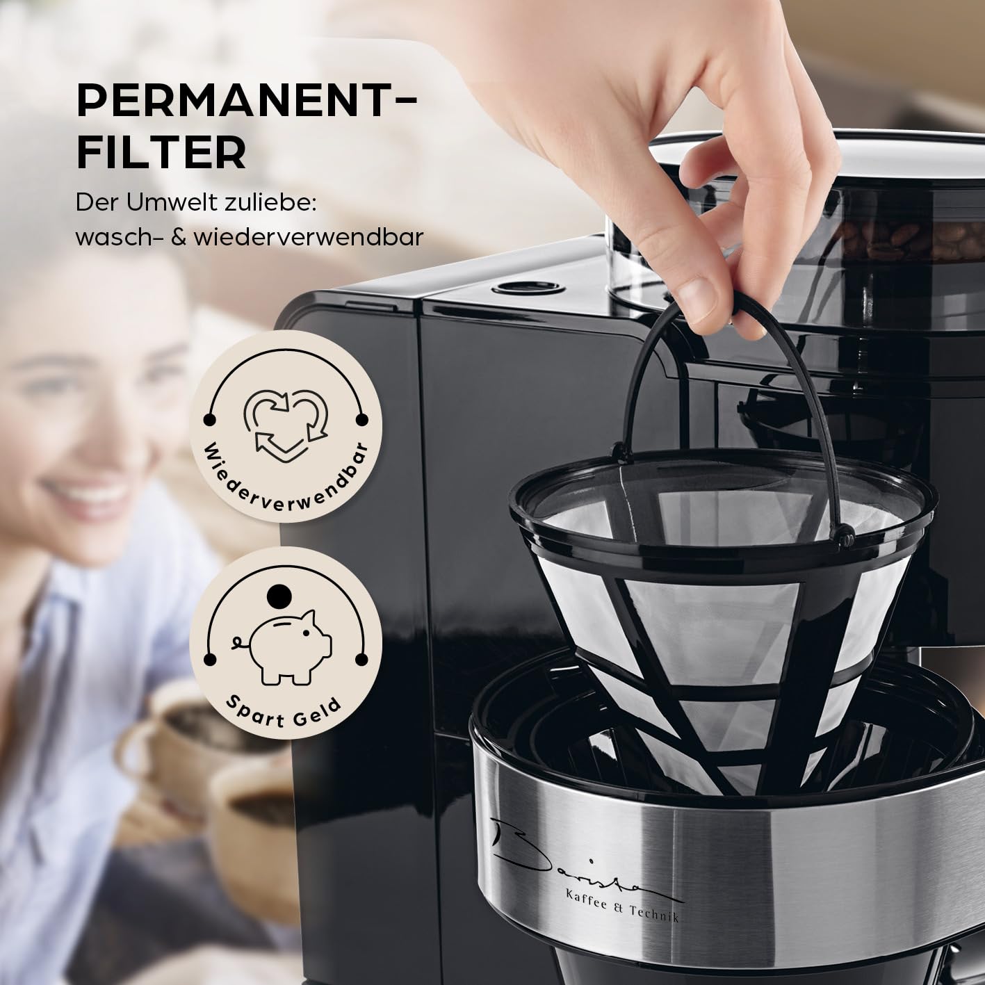 Vergessen Sie den ständigen Nachkauf von Papierfiltern. Der mitgelieferte Permanentfilter ist nicht nur kostensparend, sondern auch umweltfreundlich. Er lässt sich einfach entnehmen und unter klarem Wasser reinigen – für unkomplizierten und nachhaltigen Kaffeegenuss.