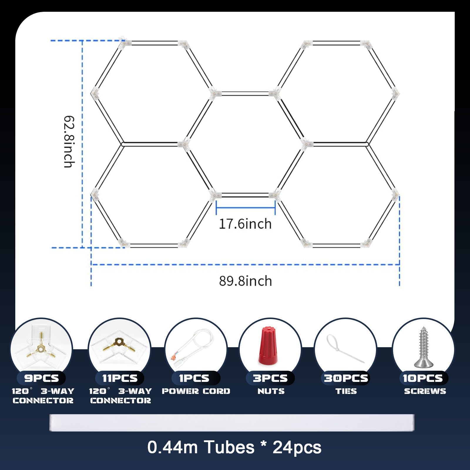 - Lieferumfang: 1x Netzkabel (für Festverdrahtung), 24x LED-Röhren, 11x 120° Zweiwege-Verbinder, 9x 120° Dreiwege-Verbinder sowie weiteres Zubehör wie Schrauben.