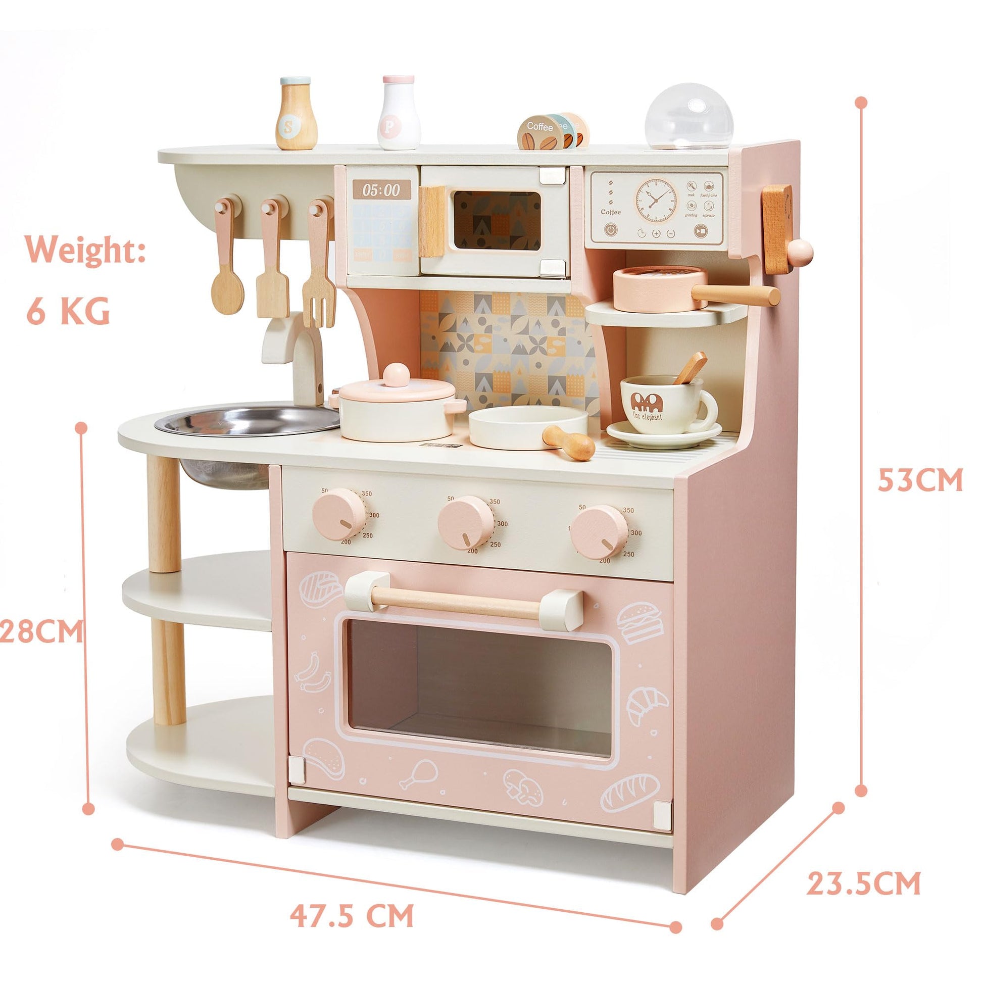 - Komplett ausgestattete Spielküche: Das Set beinhaltet alle wichtigen Elemente wie eine Spüle, einen Backofen, einen Herd, eine Mikrowelle sowie eine spezielle Kaffeemaschine.