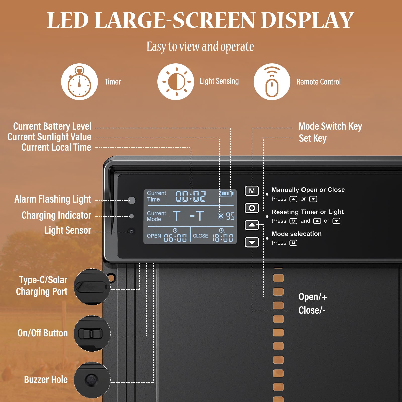 Die Programmierung der Modi, Zeiten und der Lichtempfindlichkeit erfolgt einfach über das grosse LED-Display. Zusätzlich ist eine Fernbedienung im Lieferumfang enthalten, mit der Sie die Klappe jederzeit bequem aus der Ferne manuell öffnen oder schliessen können, ohne die programmierten Automatik-Einstellungen zu verändern.