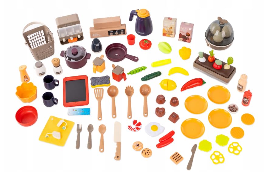 - Umfassendes Zubehör-Set: Beinhaltet 88 Teile, darunter Töpfe, Pfannen, Geschirr, Besteck sowie eine grosse Auswahl an Spiel-Obst und -Gemüse.