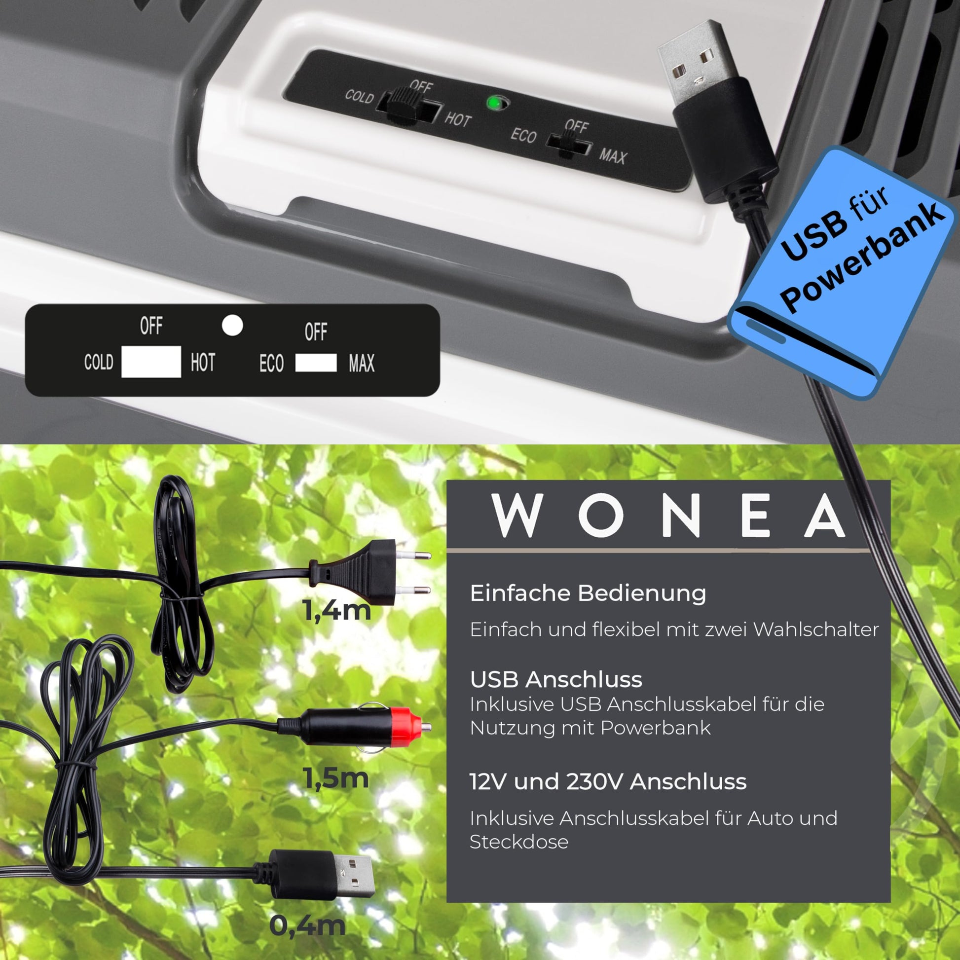 Die Kühlbox ist extrem flexibel: Sie können sie über den 230V-Netzstecker an einer normalen Steckdose, mit dem 12V-Anschluss im Auto oder LKW, und sogar mobil mit einer Powerbank über den integrierten USB-Anschluss betreiben. Alle notwendigen Kabel sind praktisch im Deckel verstaut.