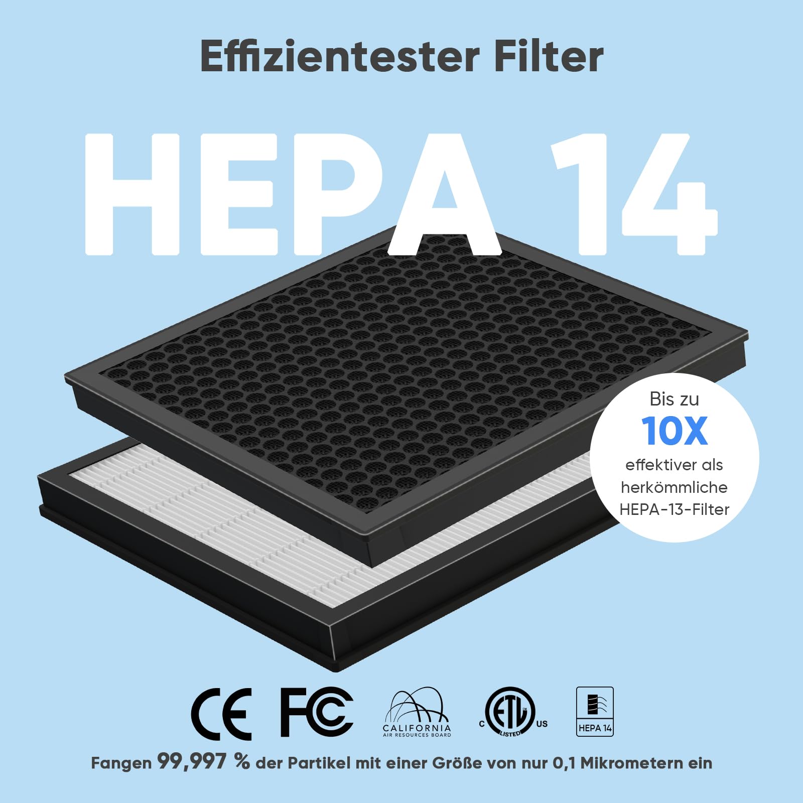 - Filter-Technologie: Kombination aus 2 waschbaren Vorfiltern und 2 H14 HEPA-Filtern mit integrierter Aktivkohle.