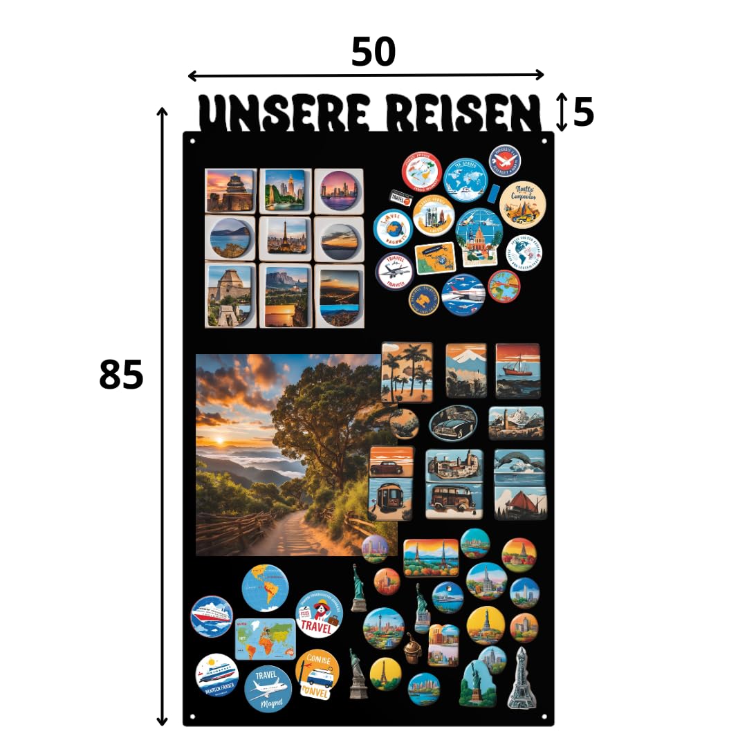 - Dekoratives Reise-Design: Ein fein ausgeschnittener Schriftzug "Unsere Reisen" verwandelt diese Magnetwand in den idealen Ort, um Souvenirs, Fotos und Magnete von Ihren Abenteuern zu präsentieren.