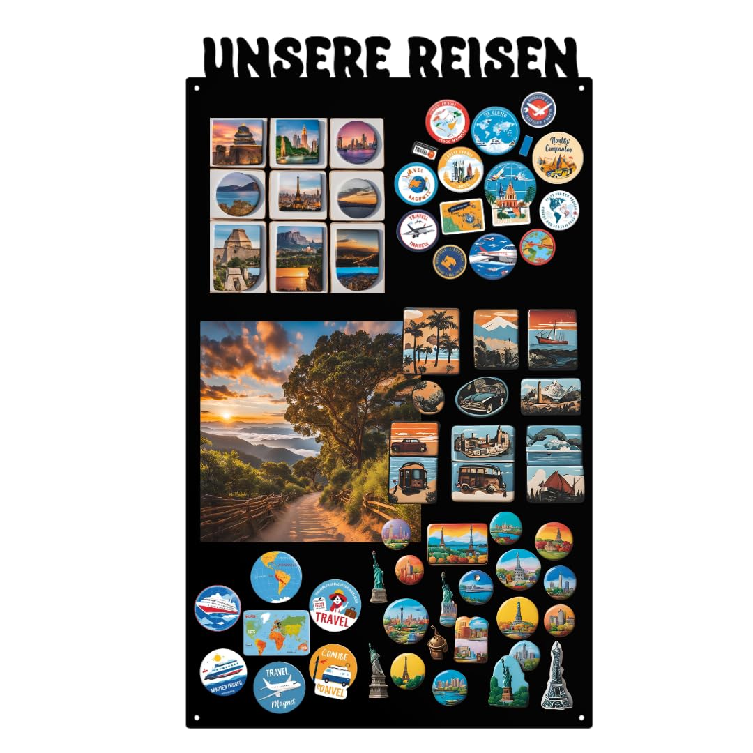 Verleihen Sie Ihren Reiseerinnerungen einen besonderen Platz mit dieser eleganten, schwarzen Magnettafel. Das stilvolle Design mit dem Schriftzug "Unsere Reisen" macht sie zu einem dekorativen Blickfang in jedem Wohnraum, in der Küche oder im Büro.