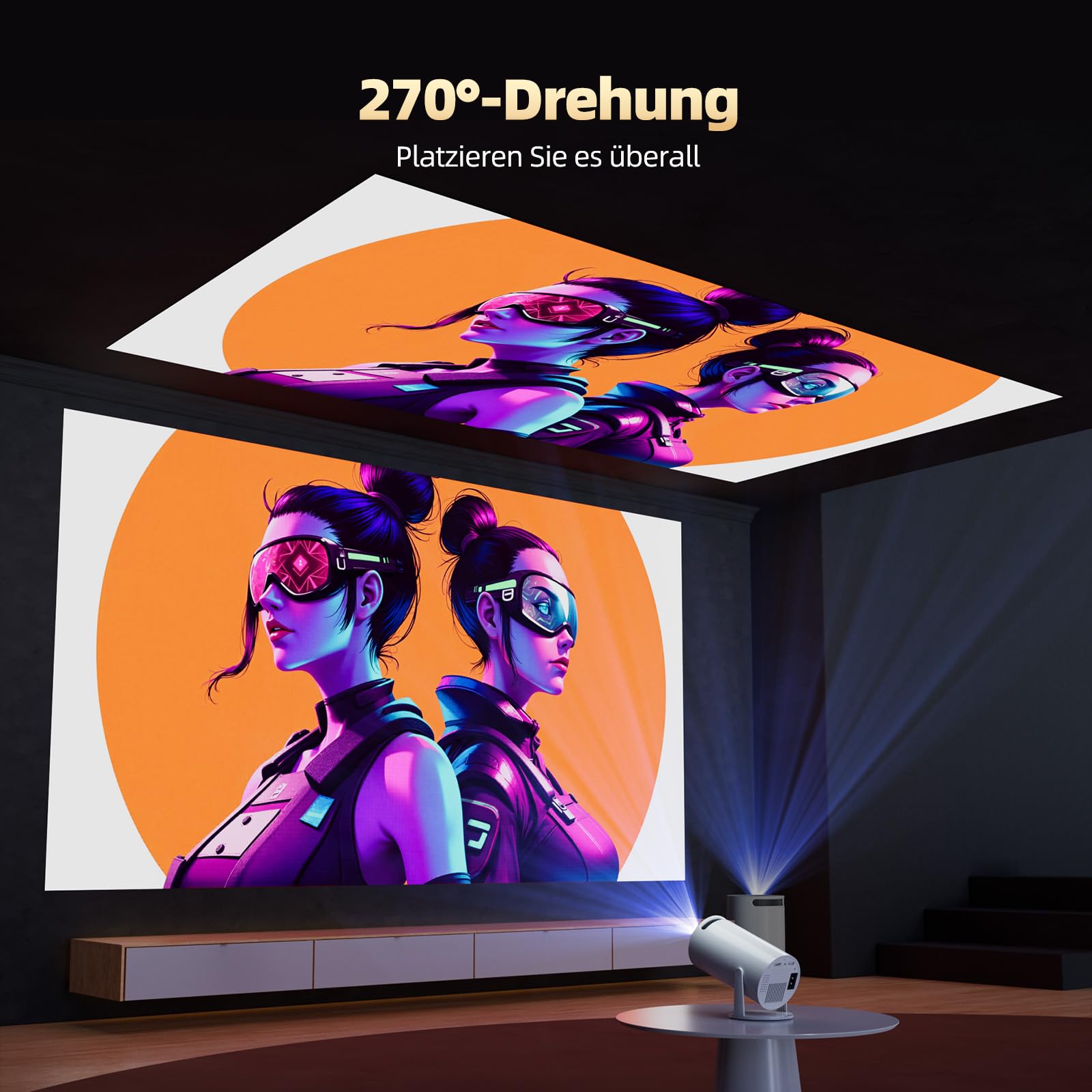 Ja, das ist eine der grössten Stärken dieses Beamers. Durch seine einzigartige, um 270° drehbare Halterung können Sie das Bild mühelos auf Wände, schräge Flächen oder direkt an die Decke projizieren, ohne den Projektor umständlich auf Büchern stapeln zu müssen. Die automatische vertikale Trapezkorrektur sorgt dabei immer für ein perfekt rechteckiges Bild.