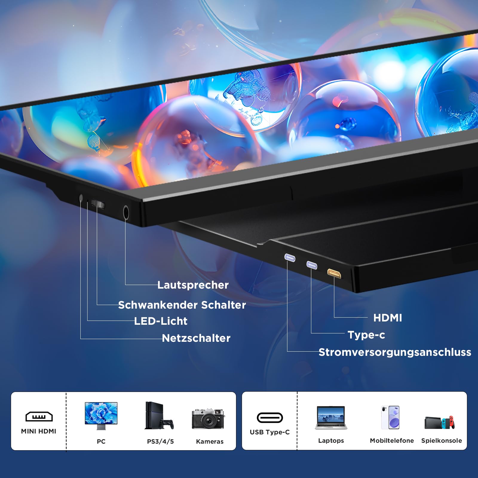 Der Bildschirm ist universell kompatibel und funktioniert nahtlos mit Laptops (Windows, Mac, Chrome, Linux), Smartphones (Android, Dex) sowie Spielekonsolen wie der PS5, Xbox oder Nintendo Switch.