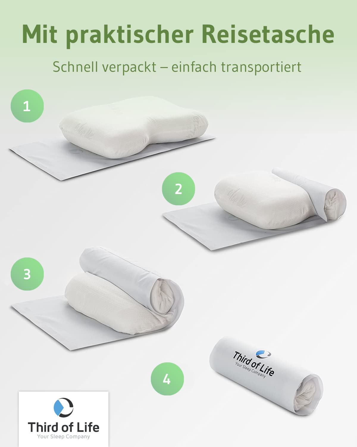 - Orthopädischer Memory-Schaum: Der Kern aus viscoelastischem Schaumstoff passt sich perfekt an und stützt die Halswirbelsäule (HWS) auf natürliche Weise.