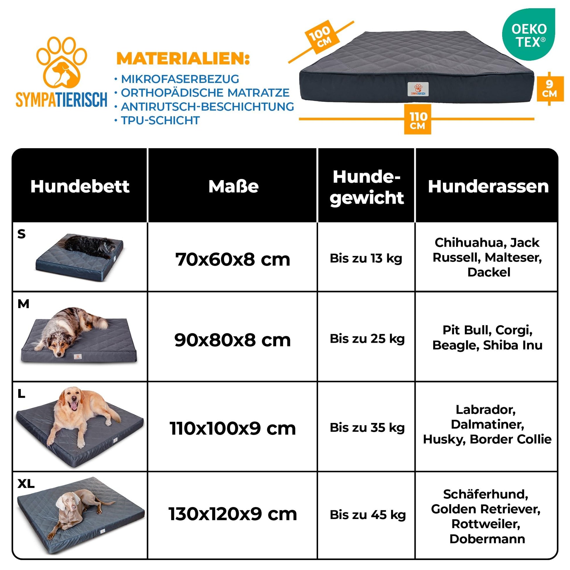 Mit seiner grosszügigen Liegefläche von 110x100 cm ist dieses Hundebett ideal für mittelgrosse bis grosse Hunderassen wie Labrador, Golden Retriever, Deutscher Schäferhund oder ähnlich grosse Hunde, die viel Platz zum bequemen Ausstrecken benötigen.
