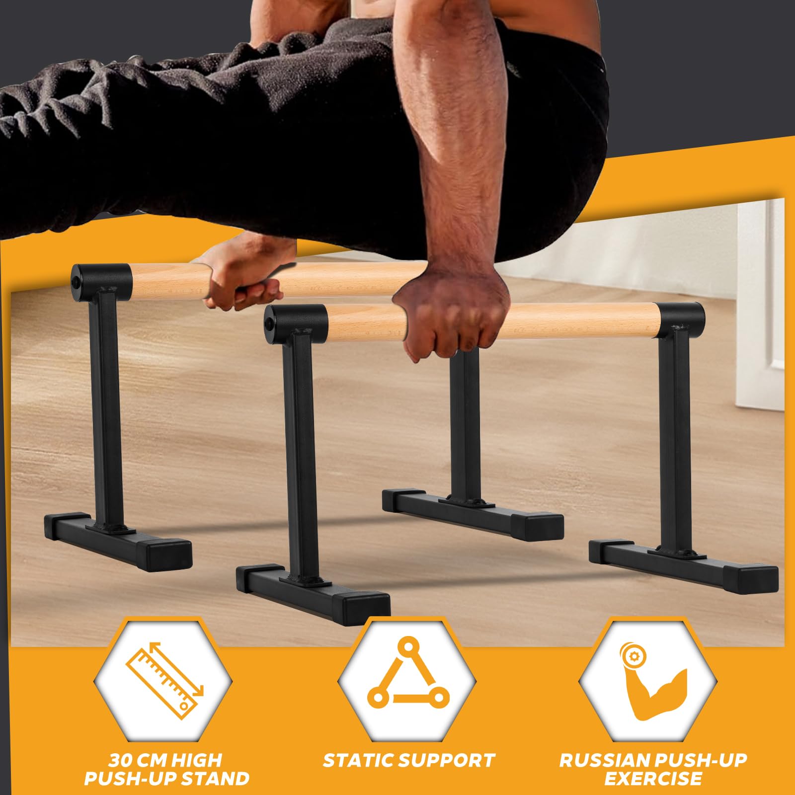 Bringen Sie Ihr Körpergewichtstraining auf das nächste Level mit diesen vielseitigen und stabilen Parallettes, die hochwertiges Buchenholz mit einer robusten Stahlkonstruktion kombinieren.