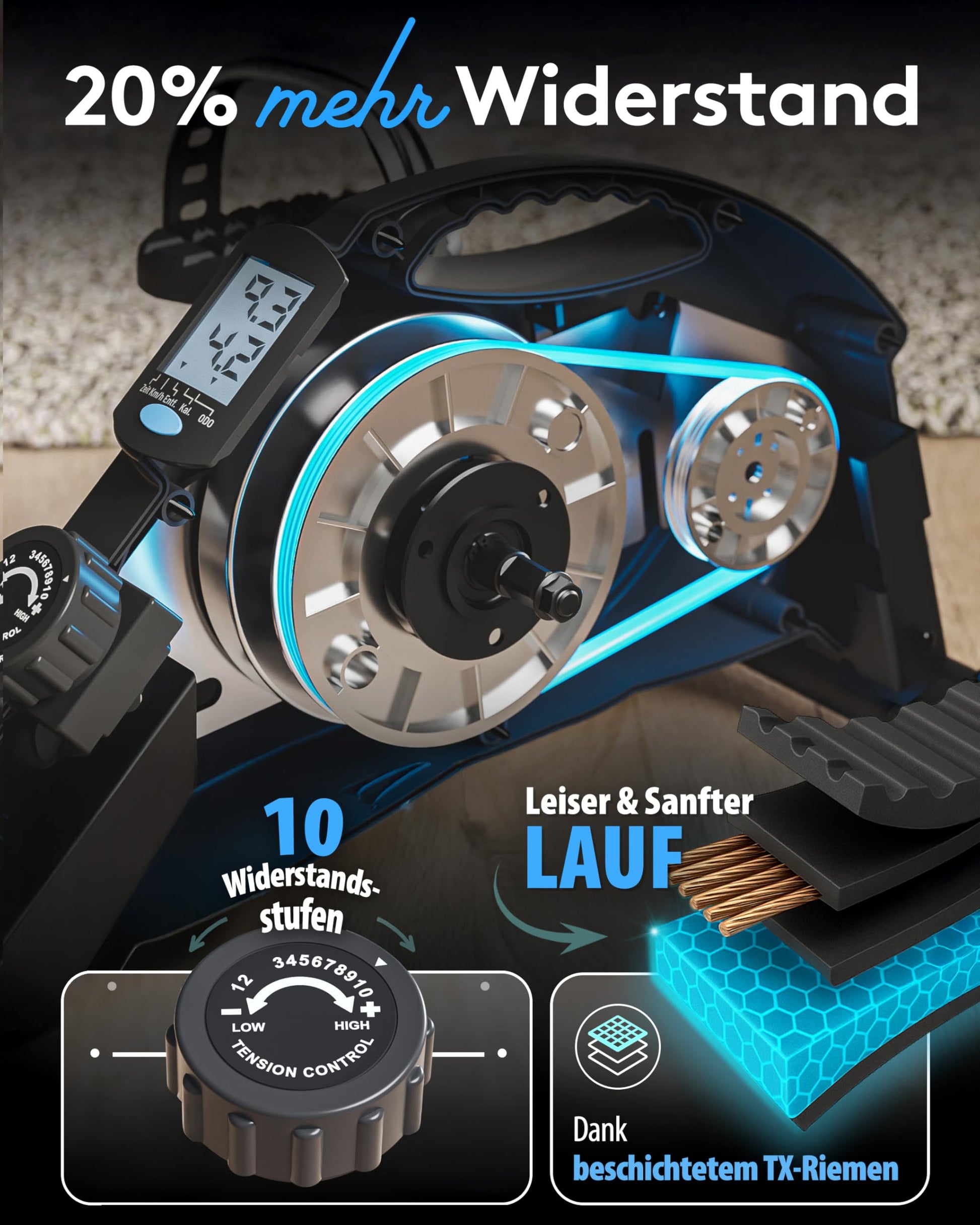 - Erhöhter Widerstandsbereich: Im Vergleich zu herkömmlichen Geräten bietet dieser Pedaltrainer 10 statt nur 8 Widerstandsstufen, was ein individuelleres und anspruchsvolleres Training ermöglicht.