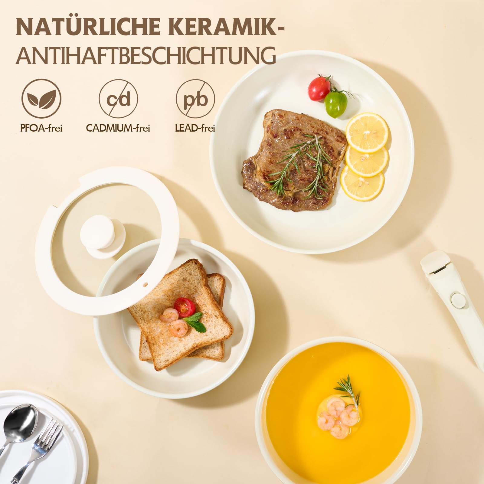 - Hochwertige Keramik-Beschichtung: Die robuste Antihaft-Oberfläche aus Keramik ist kratzfest, hitzebeständig und verhindert zuverlässig das Anhaften von Speisen.