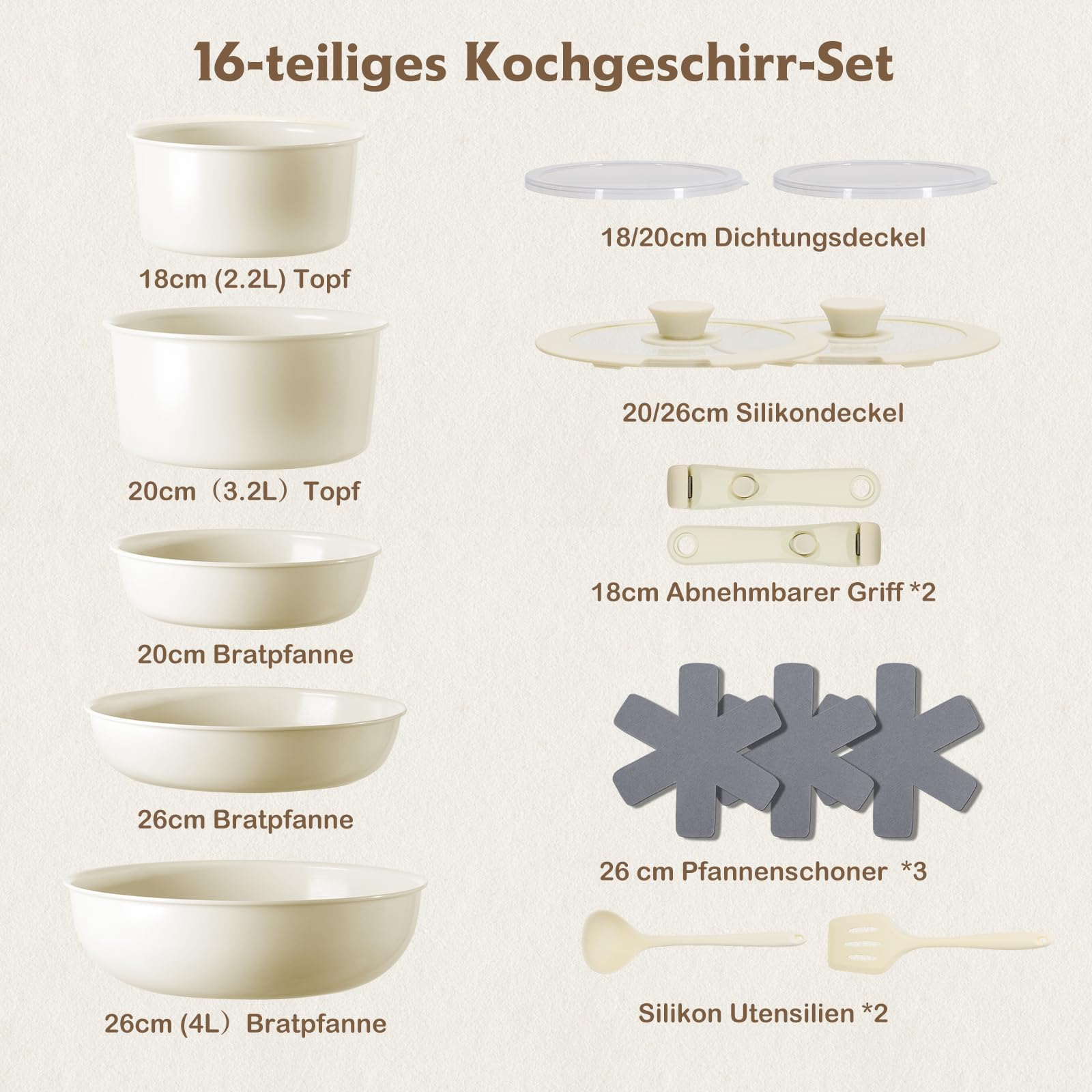- Universelle Kompatibilität: Das Set eignet sich für alle Herdarten, einschliesslich Induktion, Gas, Elektro und Glaskeramik.