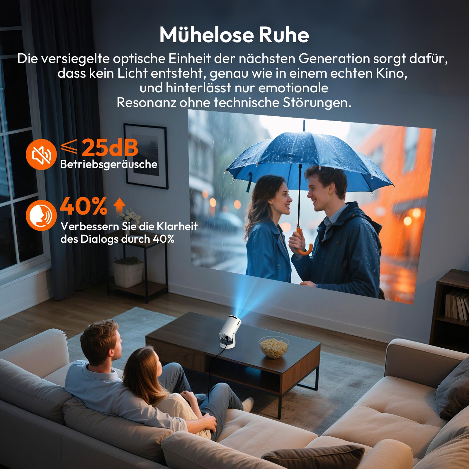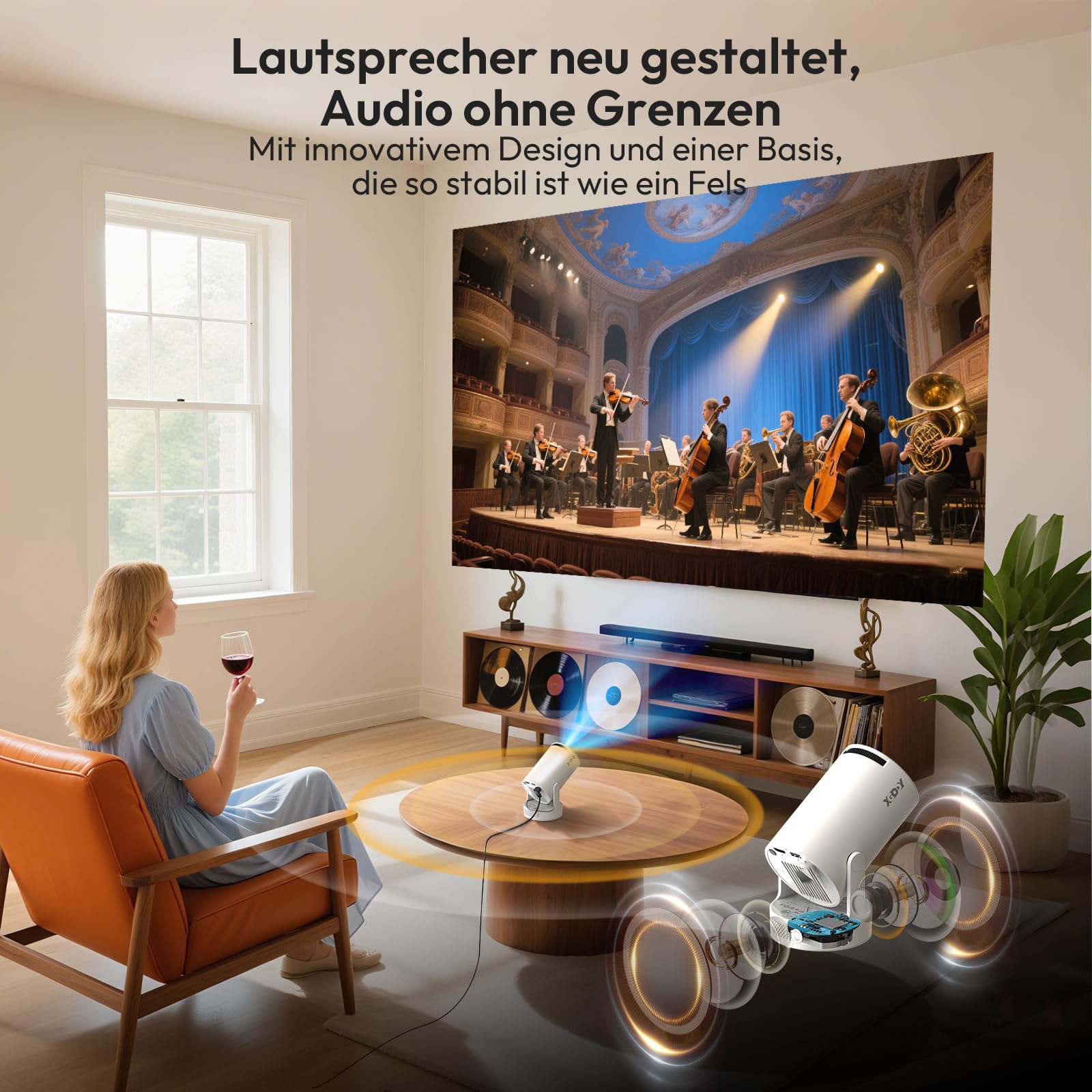 Verwandeln Sie jede Wand in ein beeindruckendes Heimkino. Dieser kompakte und intelligente Mini-Projektor vereint modernste Technologie mit aussergewöhnlicher Flexibilität für grossartige Unterhaltung, wo immer Sie sind.