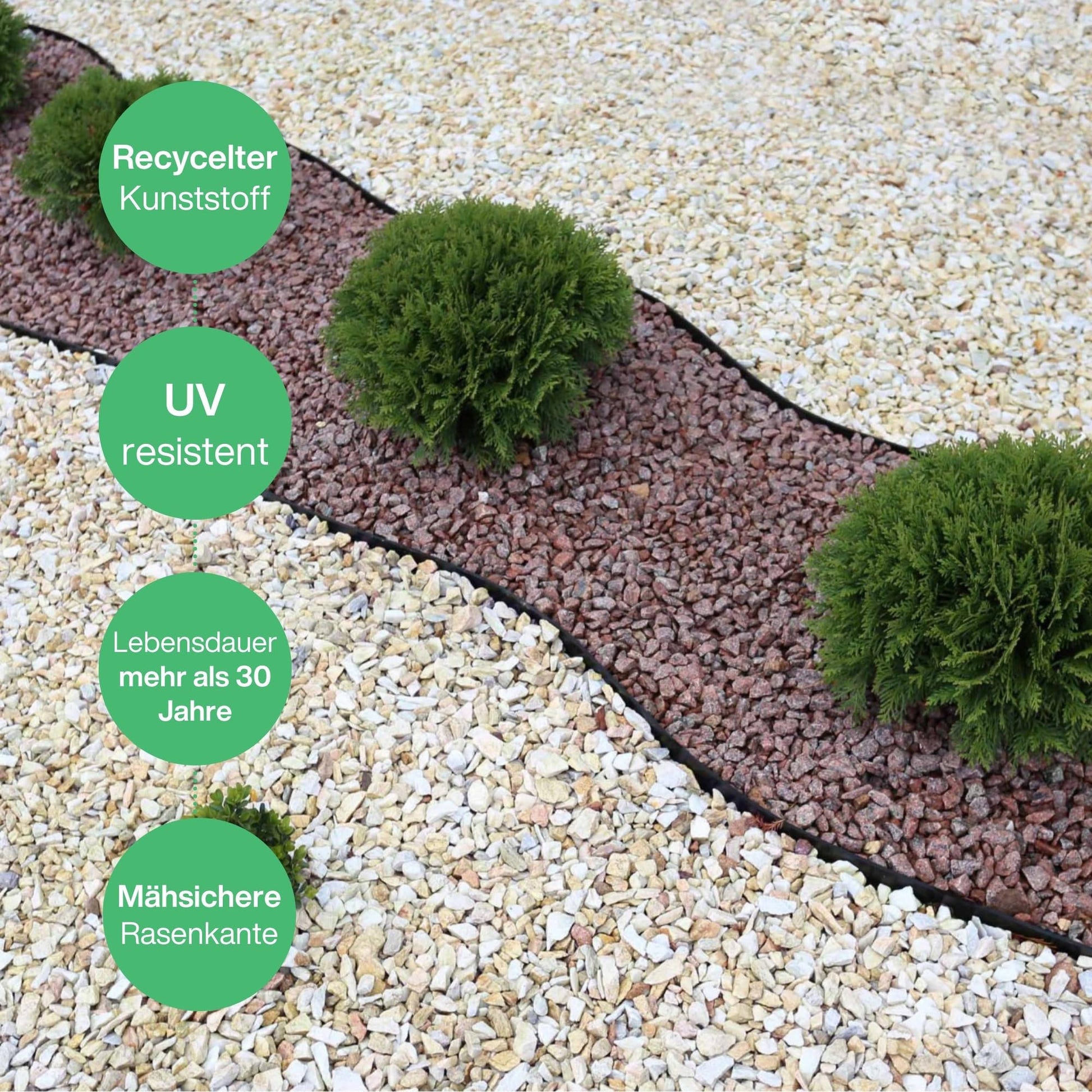 - Extrem widerstandsfähig: Die Einfassung ist UV-resistent, wasserfest und unempfindlich gegenüber Frost, Sonneneinstrahlung sowie mechanischer Belastung durch Rasentrimmer oder Rasenmäher.