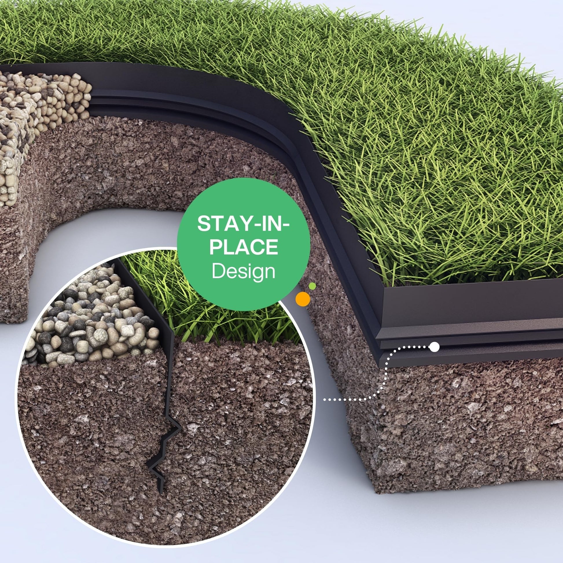 - Innovatives Stay-in-Place Design: Spezielle horizontale Nuten sorgen für einen festen Halt im Erdreich und verhindern ein Hochschieben der Kante durch Frost.