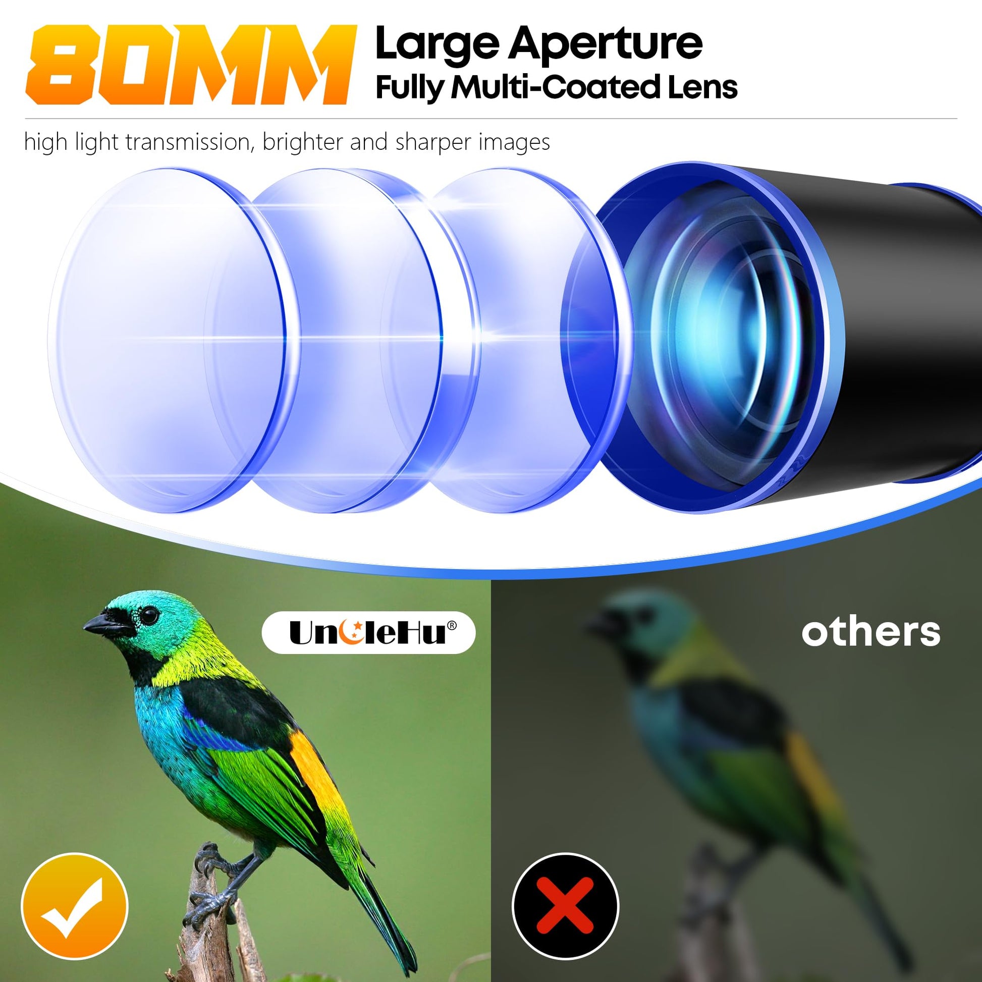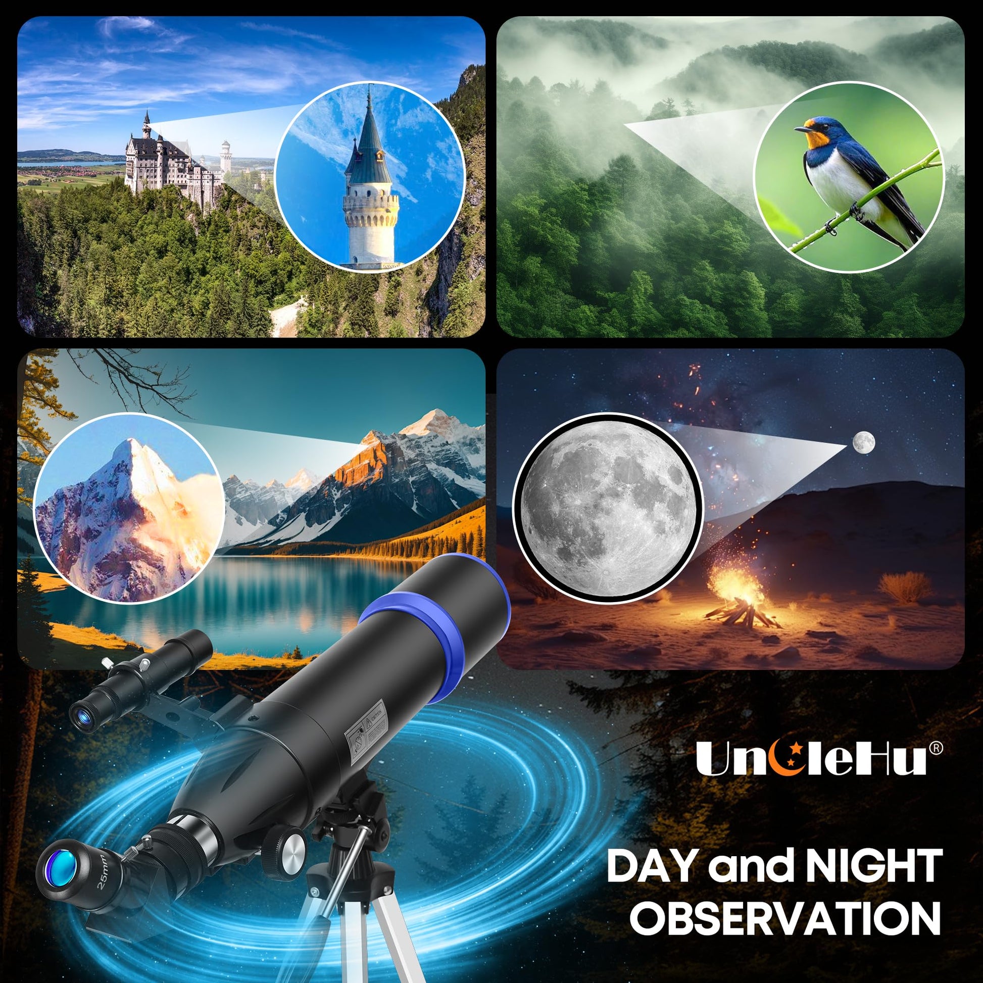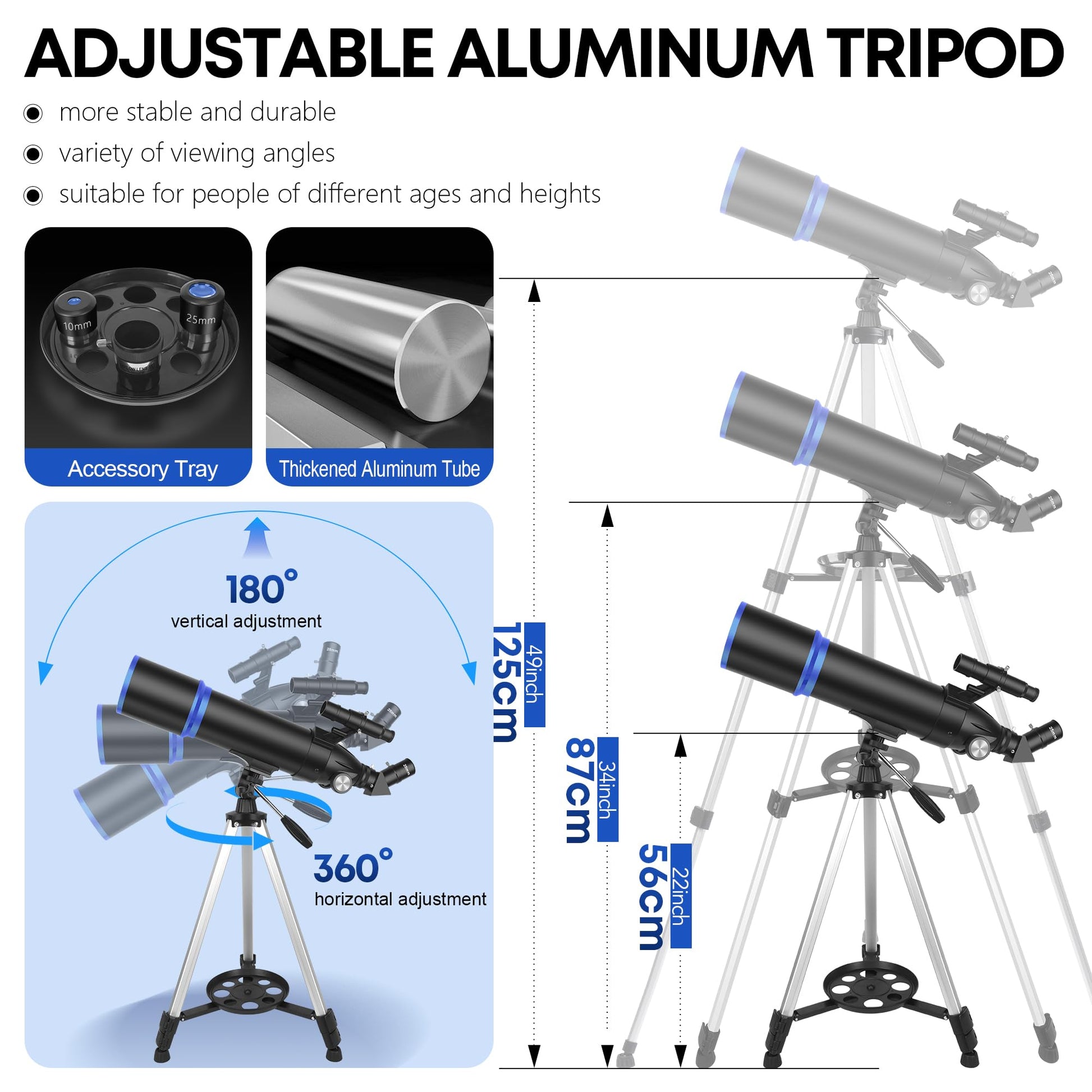 - Leistungsstarke Optik: 80 mm grosse Öffnung und 600 mm Brennweite mit vollständig mehrfach beschichteter Glaslinse für helle, kontrastreiche und farbtreue Bilder.