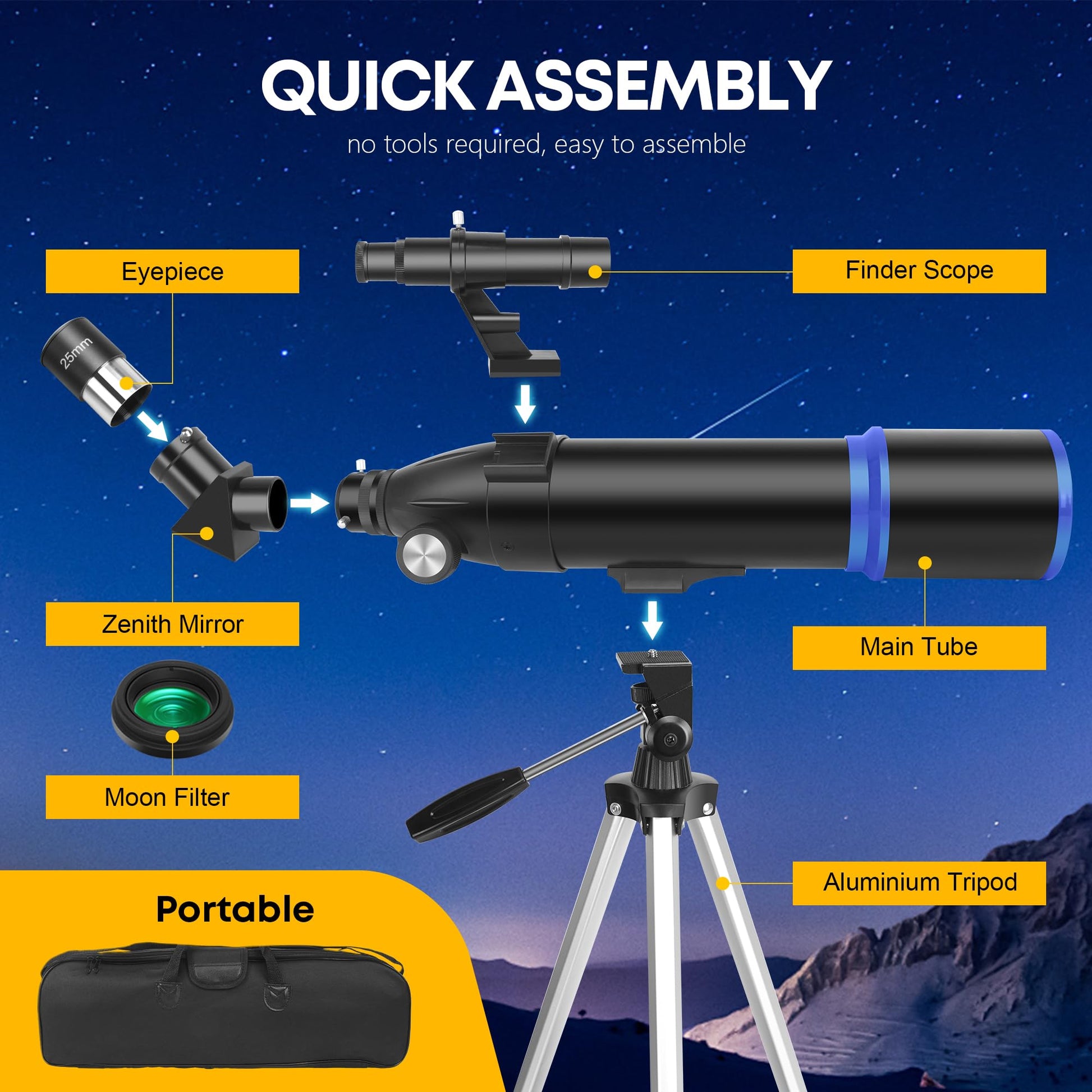 Entdecken Sie die Faszination des Sternenhimmels und die Wunder der Natur mit diesem vielseitigen Refraktor-Teleskop. Es ist der perfekte Einstieg in die Welt der Astronomie für die ganze Familie, von neugierigen Kindern bis zu erwachsenen Anfängern.