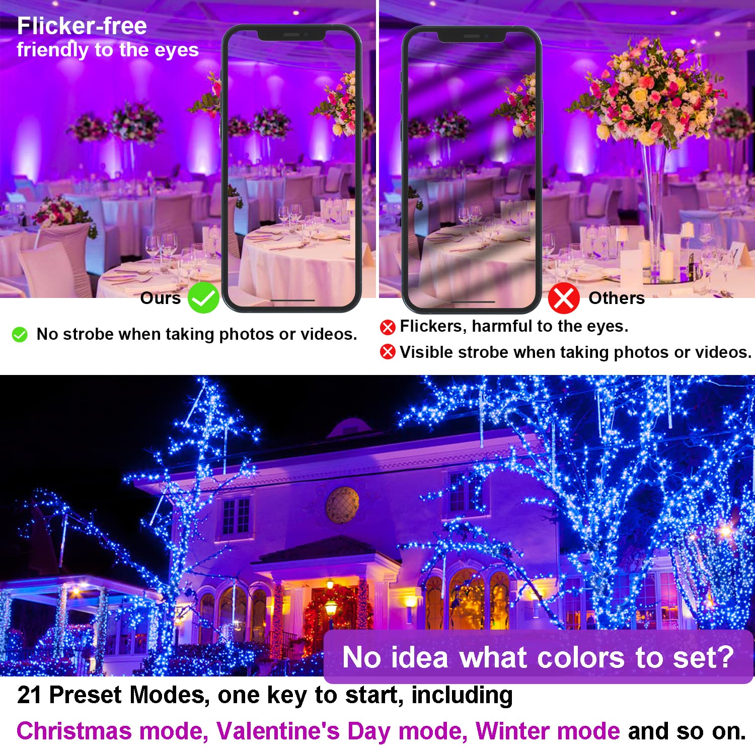 Sie haben die Wahl zwischen einem angenehmen warmweissen Licht (2700K) und Millionen von RGB-Farben. Zudem stehen 23 dynamische Effekte und 2 individuell gestaltbare Modi zur Verfügung. Die Helligkeit ist über die App stufenlos dimmbar, um für jeden Anlass die perfekte Atmosphäre zu schaffen.