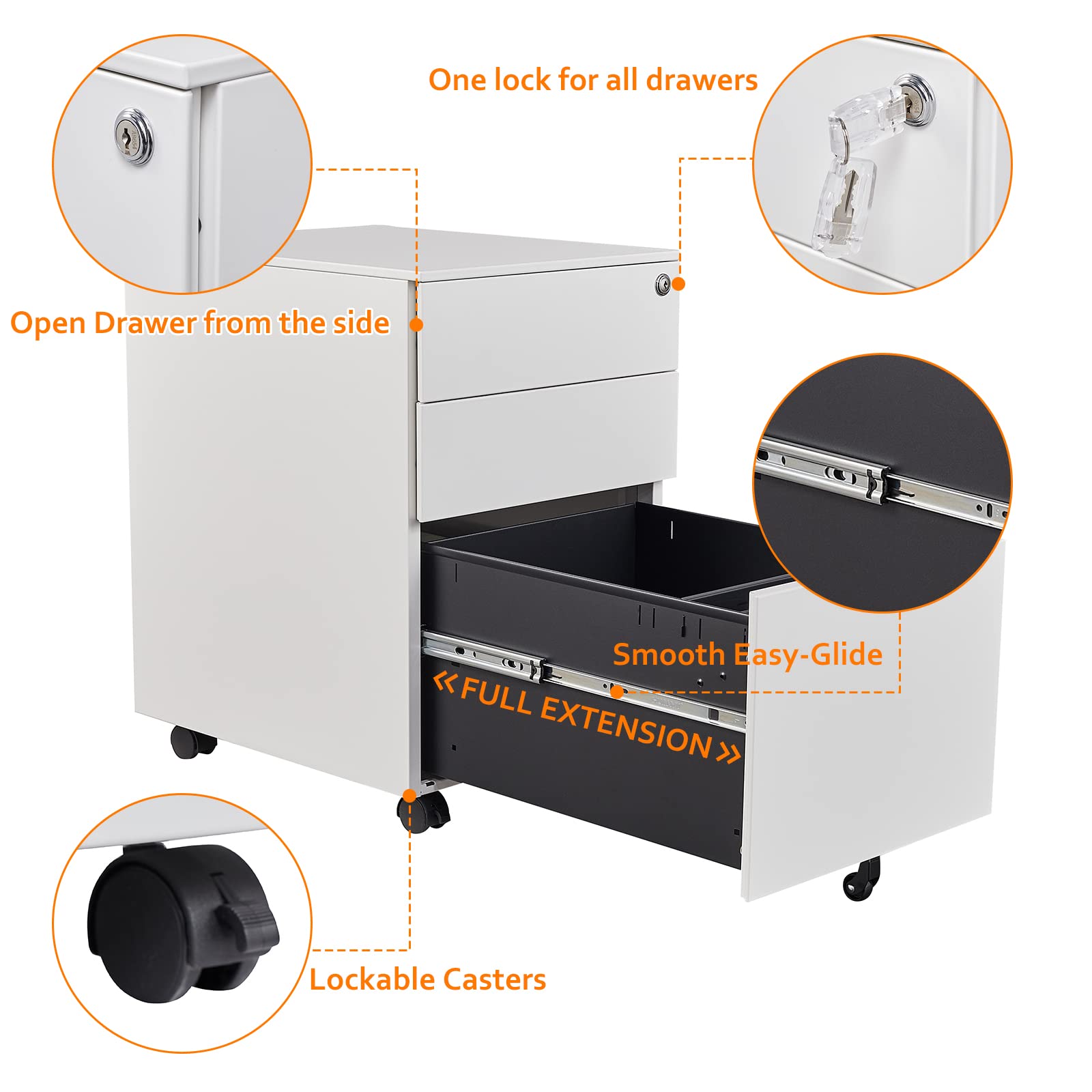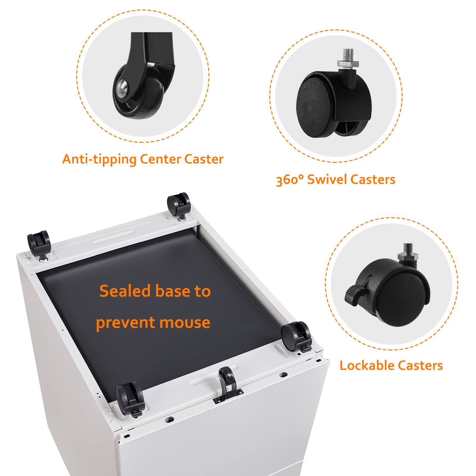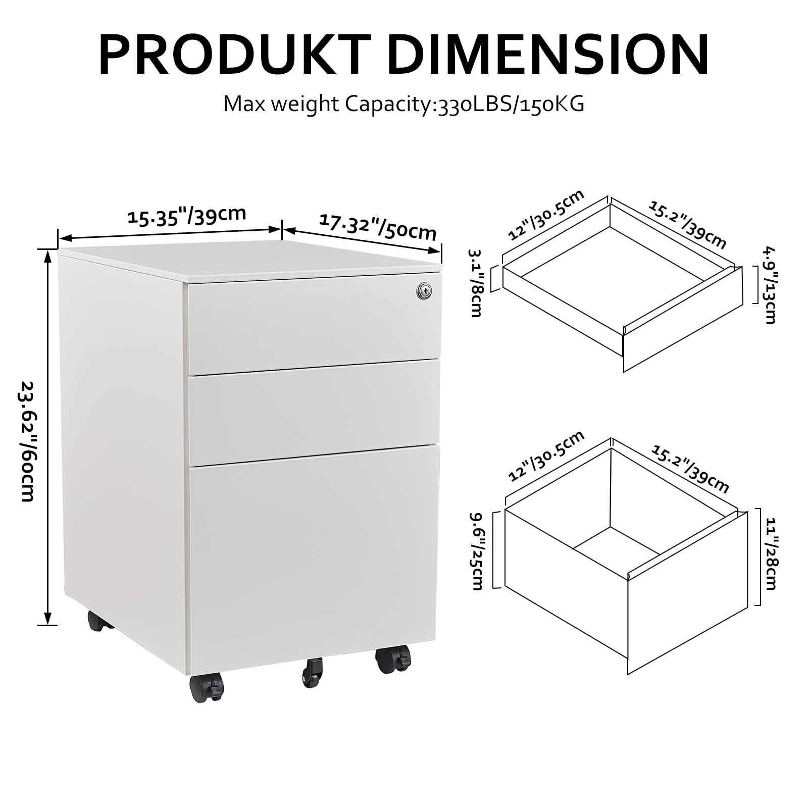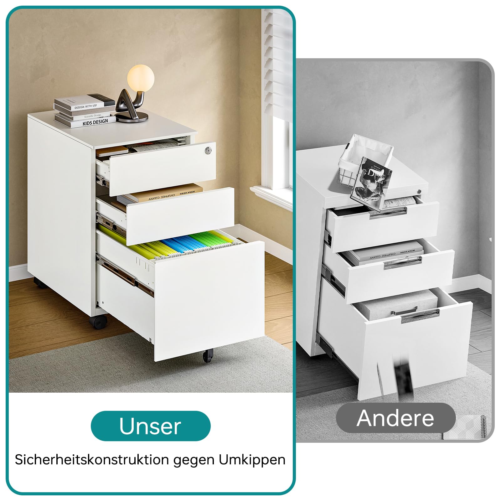 - Zentralverriegelung: Ein einziges Schloss sichert alle drei Schubladen gleichzeitig und schützt so Ihre vertraulichen Akten und persönlichen Gegenstände vor unbefugtem Zugriff.