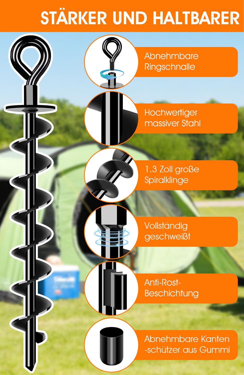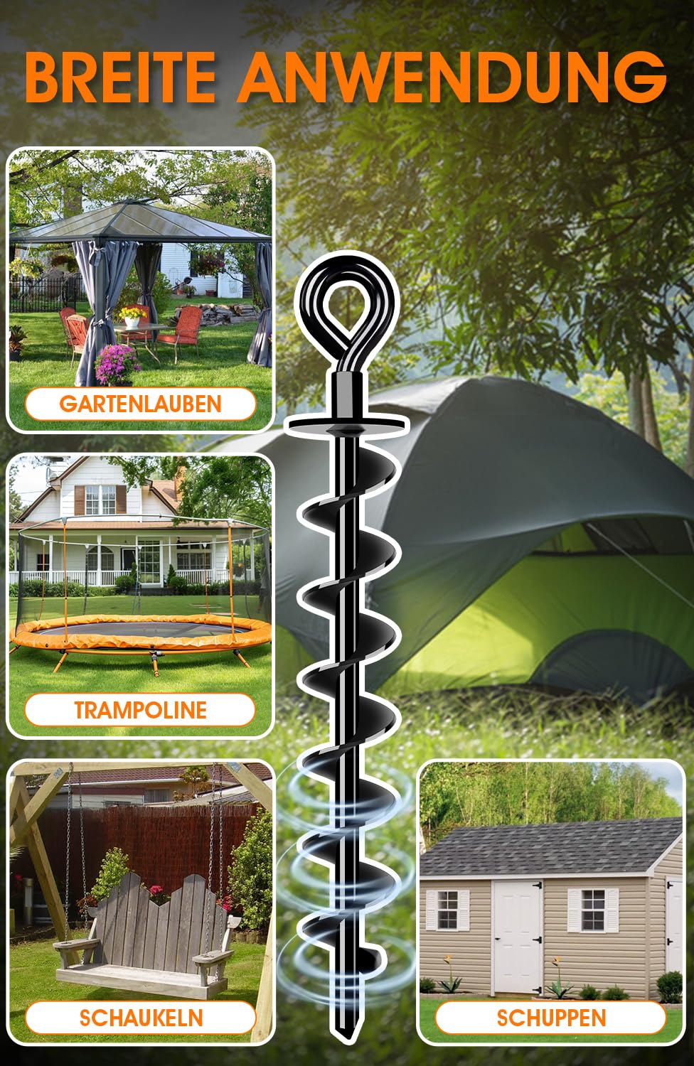 Sie sind extrem vielseitig und ideal zur sicheren Verankerung von Trampolinen, Vordächern, Schaukeln, Gartenschuppen, Zelten, Zäunen und sogar Wohnmobilen. Perfekt für den Einsatz im Garten, beim Camping und für diverse Aussenprojekte.