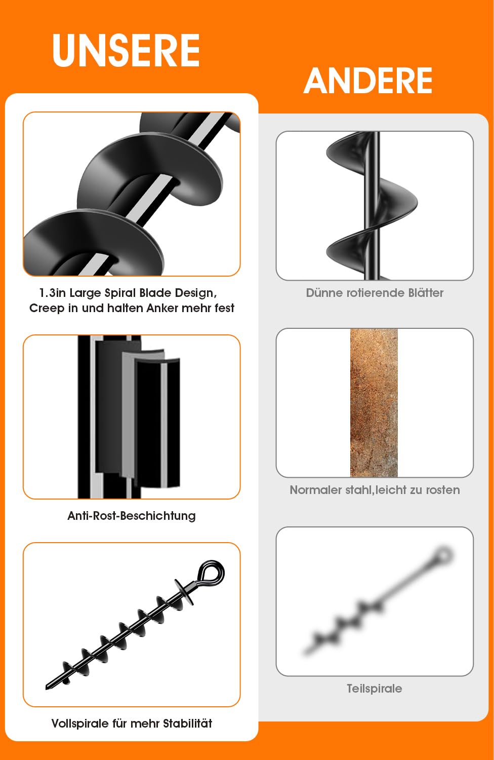 - Effektives Spiral-Design: Ein durchgehendes, spiralförmiges Blatt gräbt sich tief in den Boden und maximiert so die Reibung und den Halt. Dies gewährleistet selbst bei widrigen Wetterverhältnissen und hohen Windgeschwindigkeiten eine ausserordentliche Stabilität.
