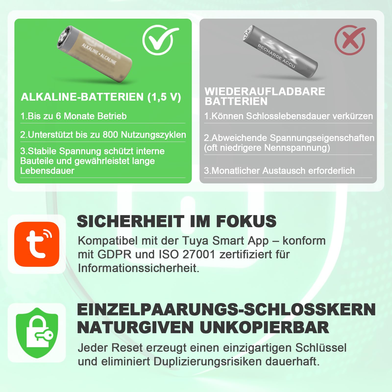 - Lange Batterielaufzeit: Drei AAA-Alkalibatterien versorgen das Schloss für über sechs Monate mit Energie. Ein USB-C-Anschluss dient als Notstromversorgung, falls die Batterien leer sind.