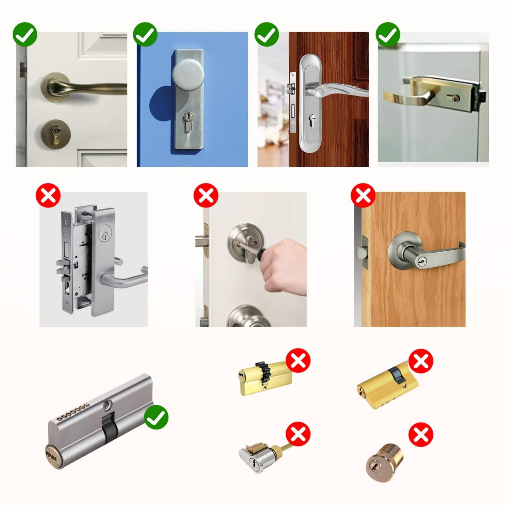 Das Schloss ist extrem flexibel und passt ohne Bohren an Türen mit einer Dicke von 60 bis 90 mm. Es ersetzt einfach Ihren vorhandenen Schliesszylinder. Dank der mitgelieferten Erweiterungsstäbe und Distanzstücke lässt sich der Zylinder perfekt anpassen, auch bei asymmetrischen Türmassen.