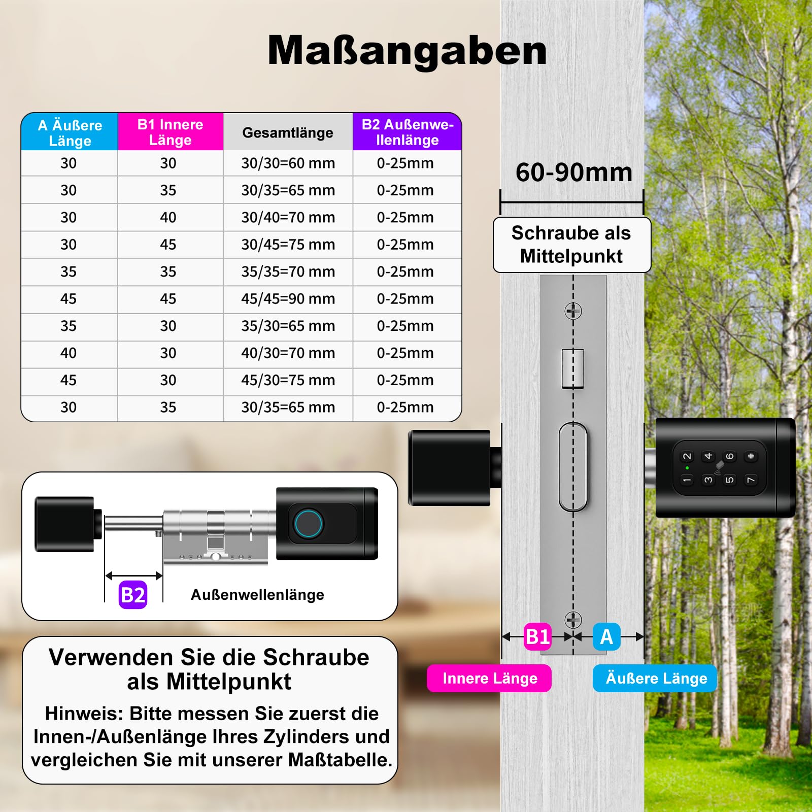 - Flexibler Einbau: Der Zylinder ist verstellbar und passt sich dank mitgelieferten Erweiterungsstäben und Distanzstücken perfekt an Türdicken von 60 bis 90 mm an, auch bei asymmetrischen Türen.
