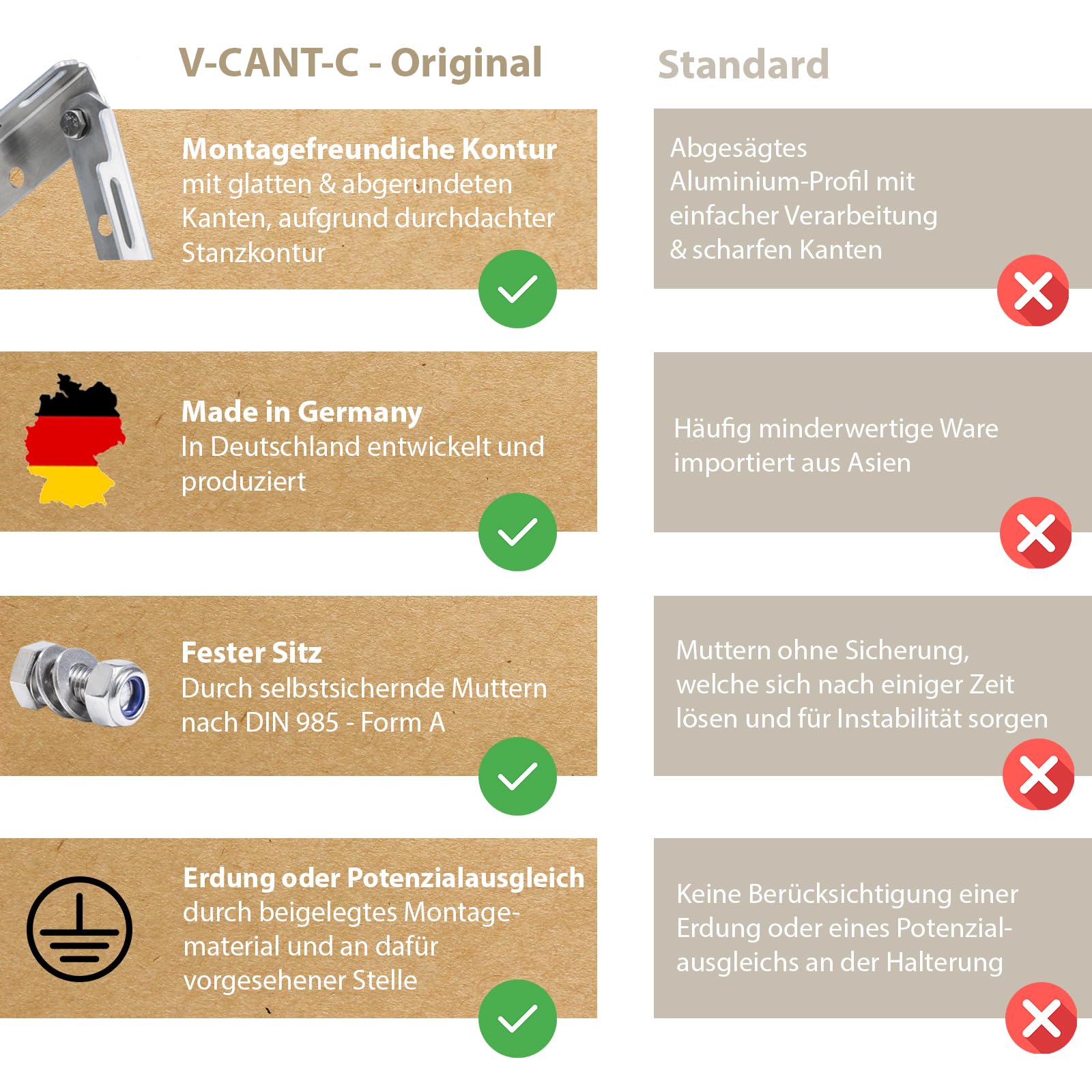 Langlebigkeit und deutsche Ingenieurskunst: Die Halterungen werden mit Leidenschaft in Deutschland entwickelt und produziert. Die Verwendung von hochwertigem Aluminium und Edelstahlschrauben garantiert eine ausserordentliche Belastbarkeit und Wetterbeständigkeit. Jedes Set wird von Hand geprüft, um die hohe Produktqualität von V-CANT-C sicherzustellen.
