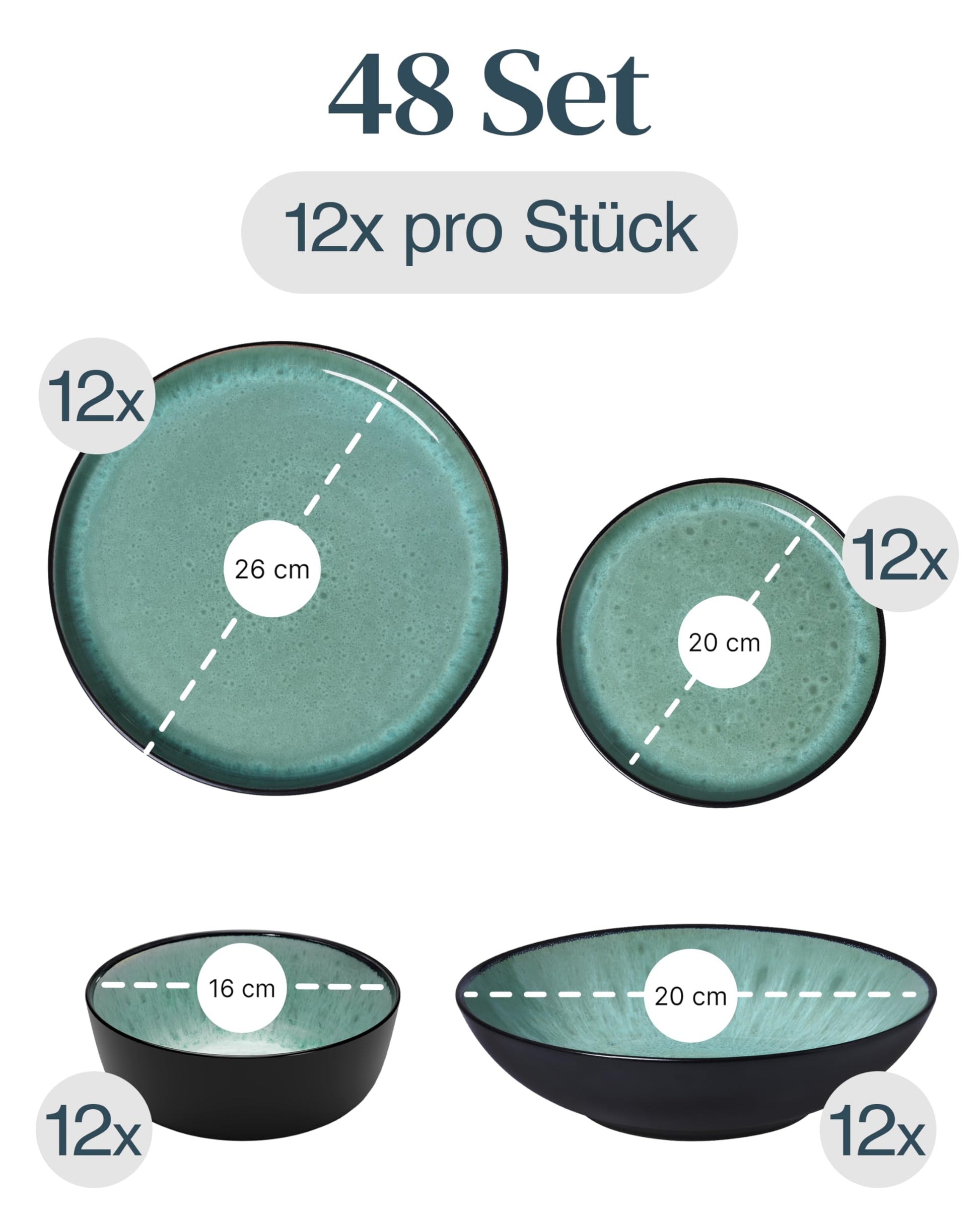 Das umfassende Set ist für bis zu 12 Personen konzipiert und beinhaltet je 12 Speiseteller, 12 Frühstücksteller, 12 tiefe Teller (ideal für Suppen oder Pasta) und 12 vielseitige Schüsseln.