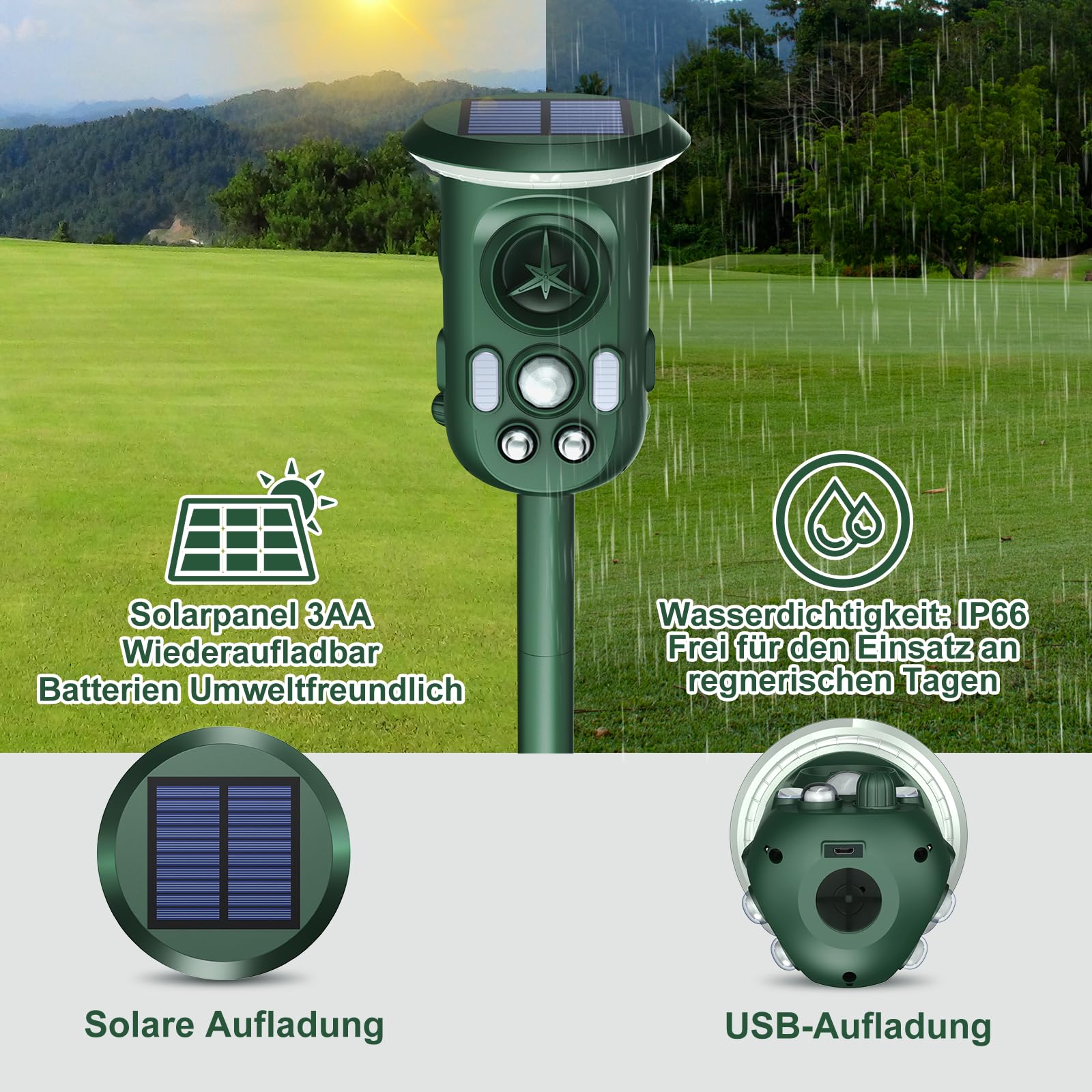 Dank der autarken Stromversorgung durch das Solarpanel arbeitet das Gerät energieeffizient und umweltfreundlich. Sie müssen sich keine Sorgen um einen Batteriewechsel machen, und die USB-Ladeoption bietet zusätzliche Sicherheit an sonnenarmen Tagen.