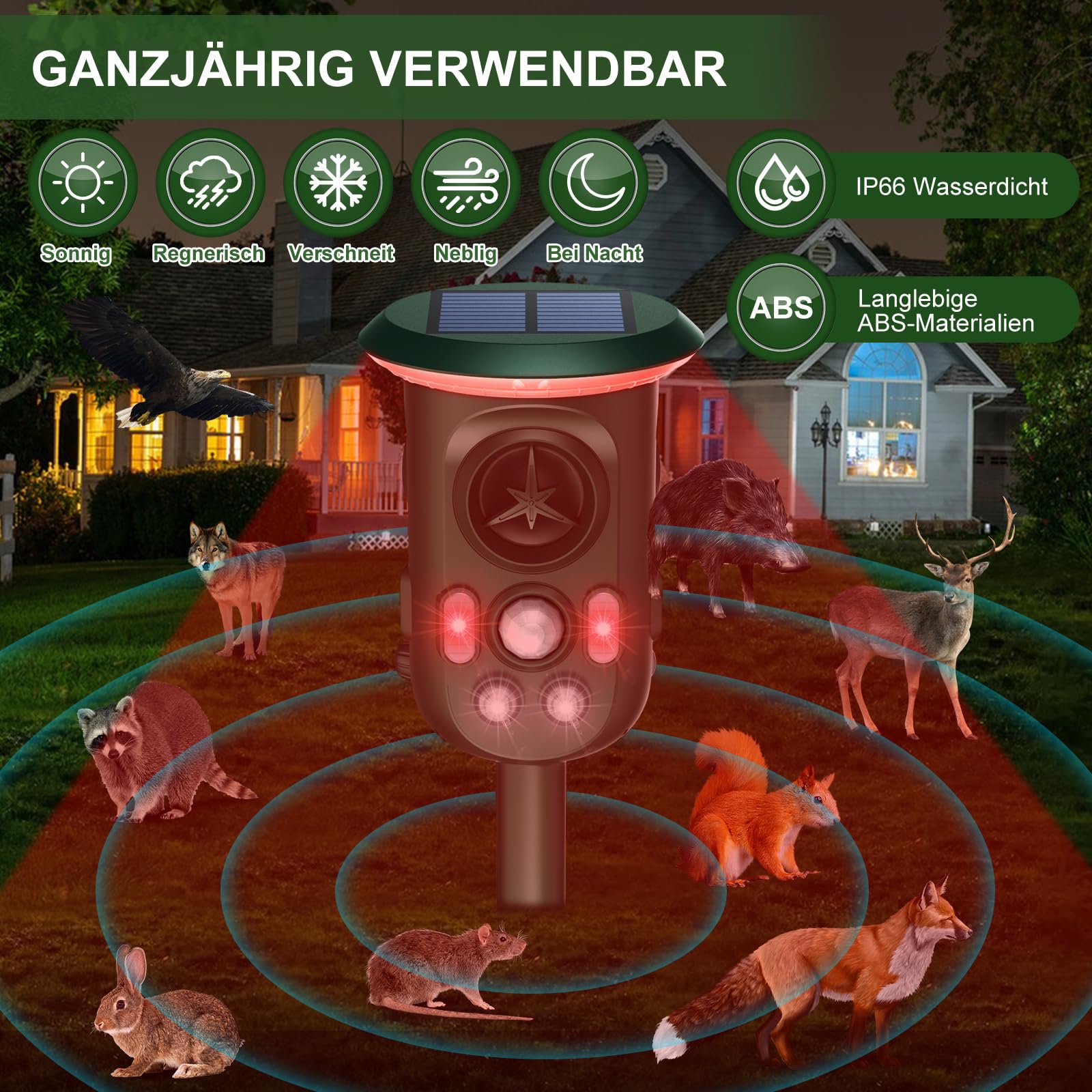 - Vierseitiger 360°-Schutz: Das Gerät kombiniert Infrarot-Bewegungssensoren, LED-Blitzlichter, Ultraschallsender und Alarmtöne auf vier Seiten, um Tiere aus allen Richtungen zuverlässig zu erkennen und zu vertreiben.
