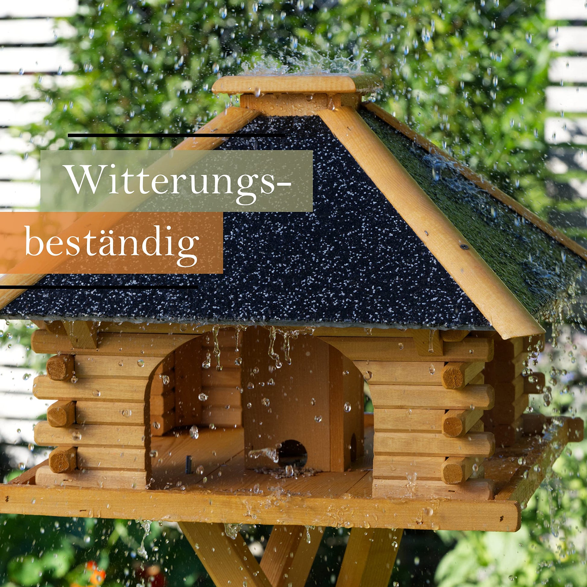 Das Vogelhaus ist sehr wetterbeständig. Das Holz ist bereits mit einem Holzschutzmittel vorbehandelt und das robuste Dach aus Stein (anthrazit/grau) schützt das Futter zuverlässig vor Nässe. Um die Langlebigkeit zu maximieren, wird eine gelegentliche Nachbehandlung des Holzes empfohlen.