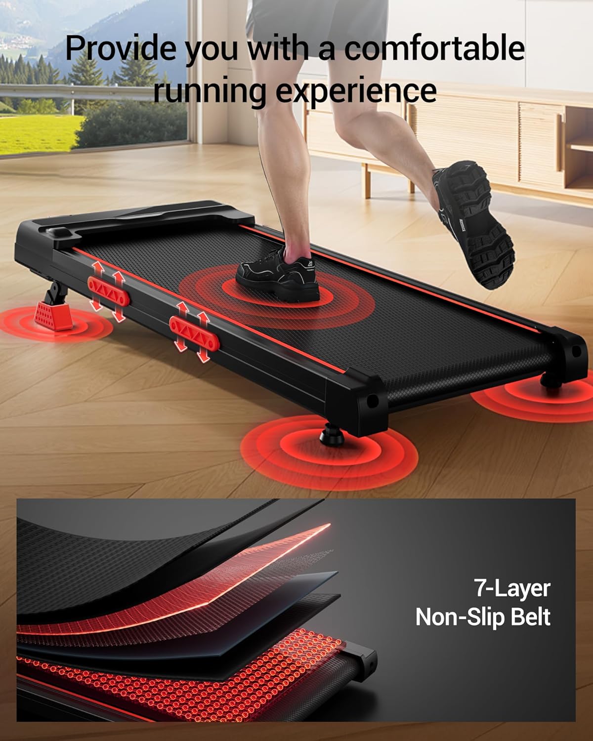 - Dreifach-Dämpfungssystem: Eine Kombination aus mehrschichtigem Laufgurt, Wabengummi-Pads und Silikondämpfern schont Ihre Gelenke.