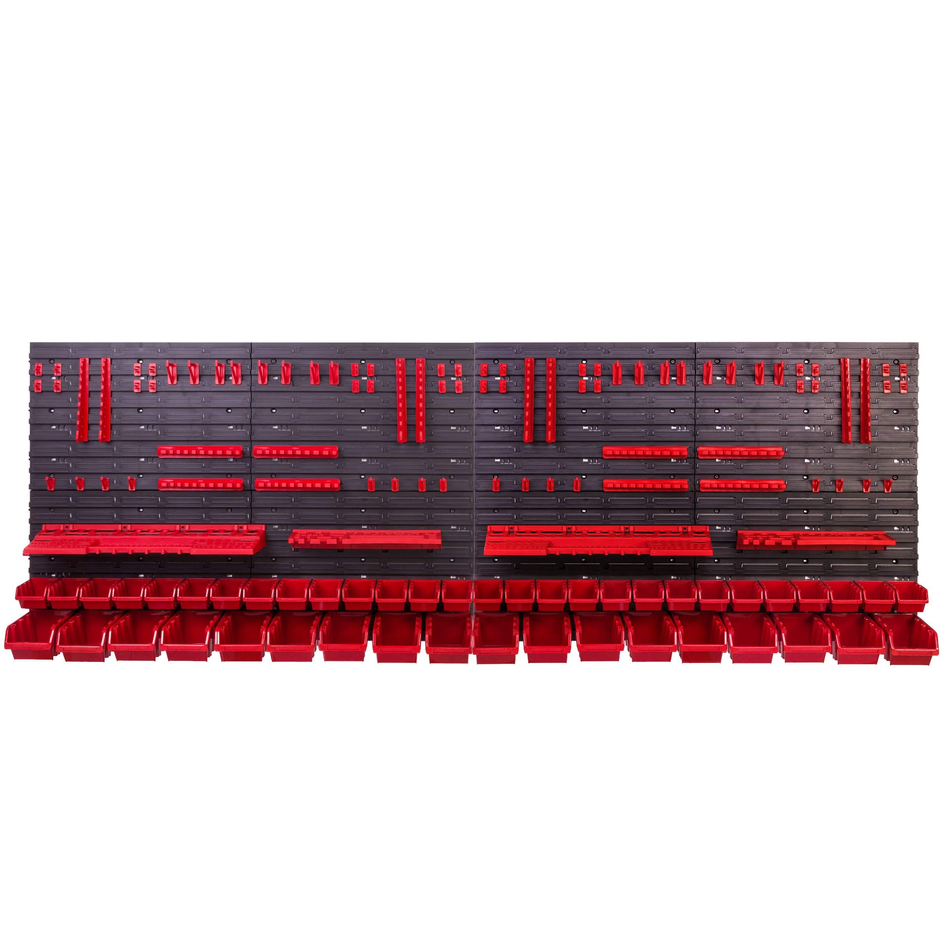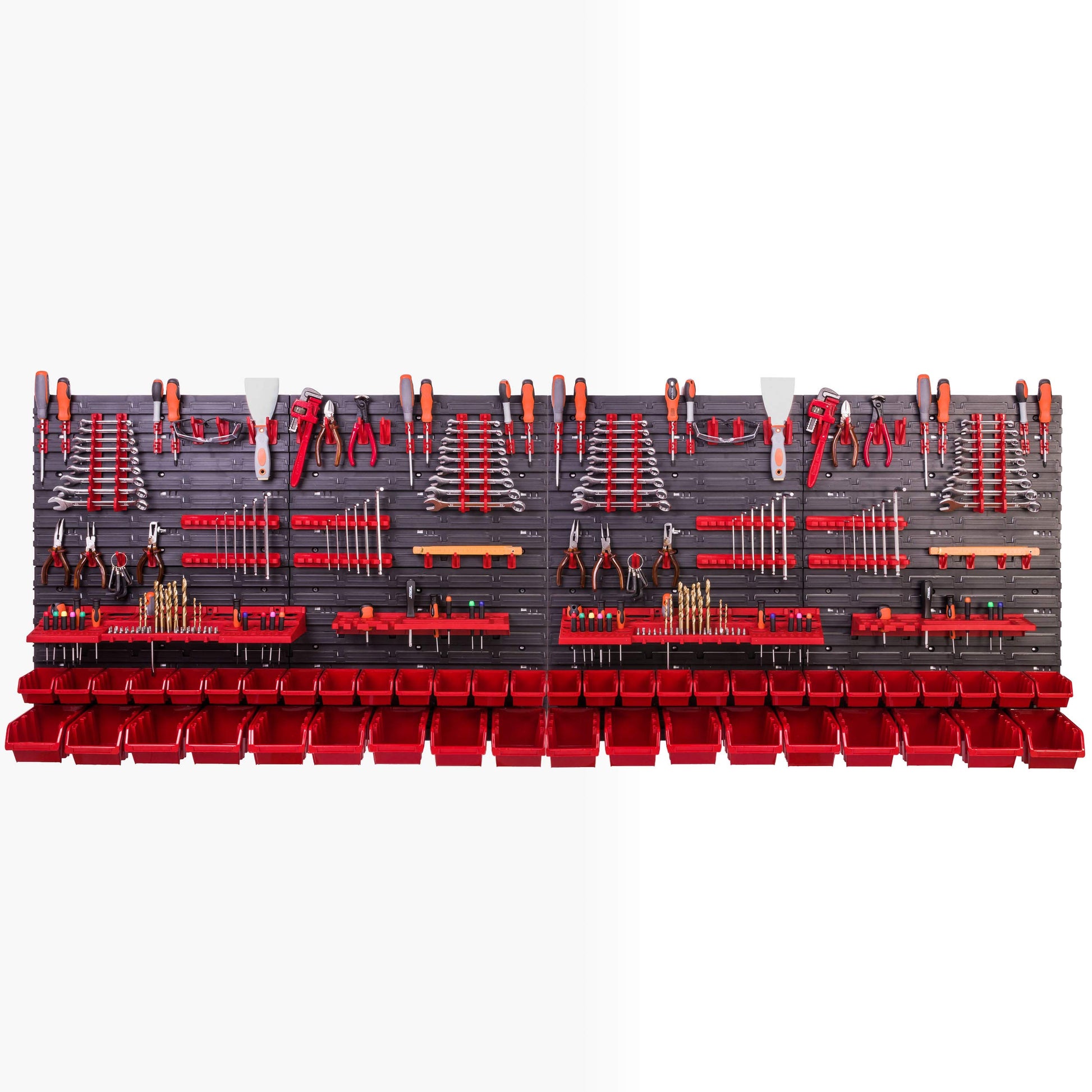 Das Komplettset besteht aus 8 extra starken Wandplatten (Gesamtgrösse ca. 234 x 78 cm), 46 roten Stapelboxen in zwei Grössen, 4 Schraubenschlüsselablagen, 8 Klemmleisten, 32 Werkzeughaken (M & XXL), 32 Werkzeugklemmen und 4 Universal-Werkzeughaltern (M & XXL).