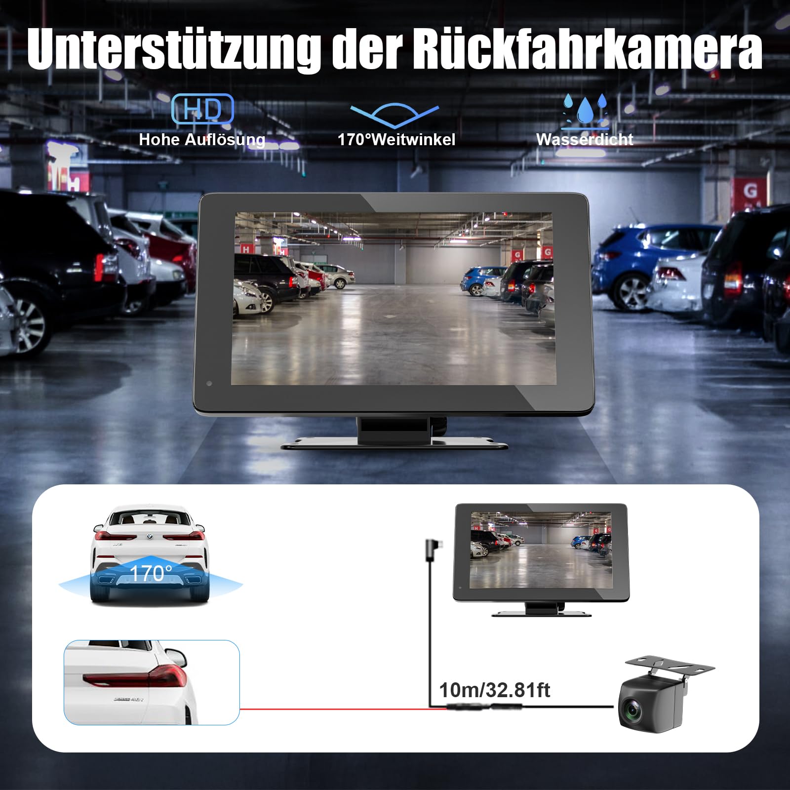 Die HD-Rückfahrkamera wird mit dem Display verbunden und an die Stromversorgung Ihres Rückfahrlichts angeschlossen. Sobald Sie den Rückwärtsgang einlegen, schaltet der Bildschirm automatisch auf das Kamerabild um und hilft Ihnen so, sicher und einfach einzuparken.