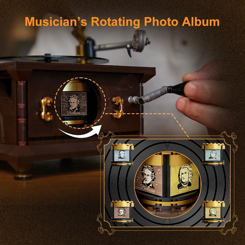 - Drehbares Vintage-Album: Ein faszinierendes Detail ist das integrierte Fotoalbum. Es rotiert synchron mit der Schallplatte, sobald der Tonarm bewegt wird, und gibt durch clevere Aussparungen den Blick auf vier berühmte klassische Komponisten frei.
