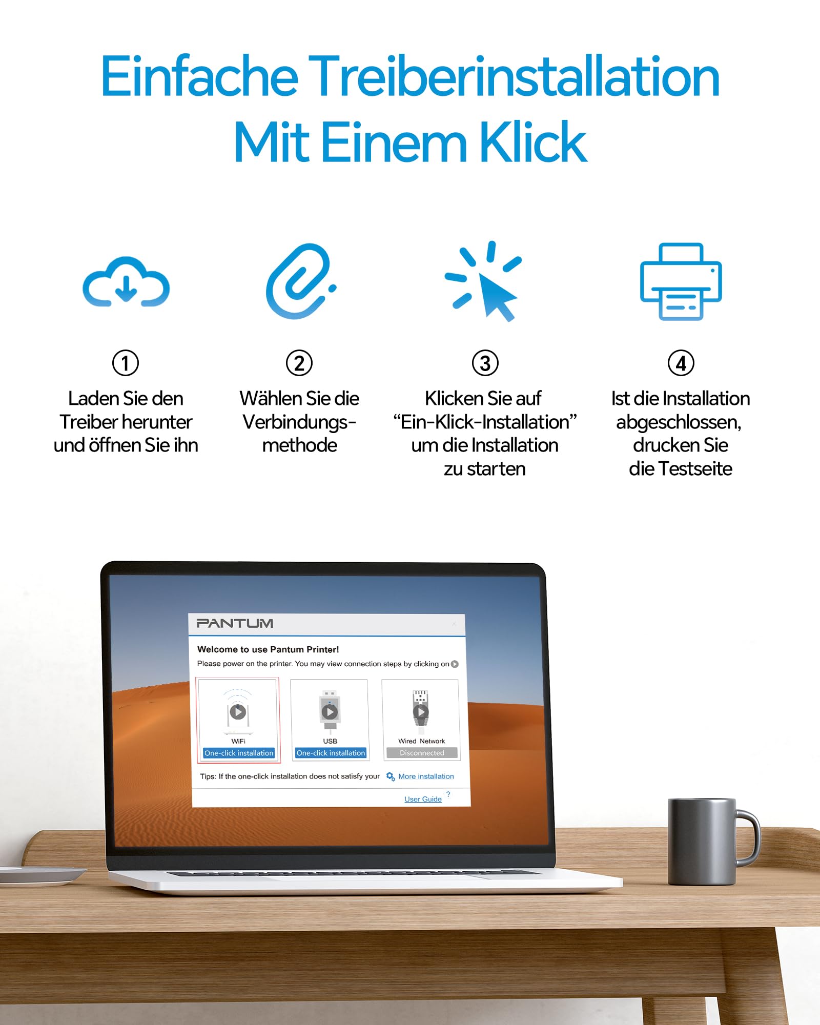 - Unterstützung für mobiles Drucken via AirPrint, Mopria, WLAN-Direktverbindung und Pantum App.