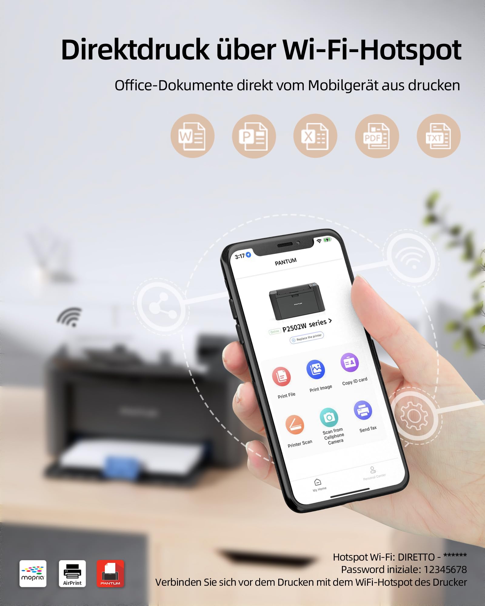 Ja, absolut. Der Drucker verfügt über integriertes WLAN und unterstützt mobiles Drucken über die PANTUM-App. Dank der Kompatibilität mit AirPrint können Sie auch nahtlos von Apple-Geräten wie iPhone, iPad oder Mac drucken.