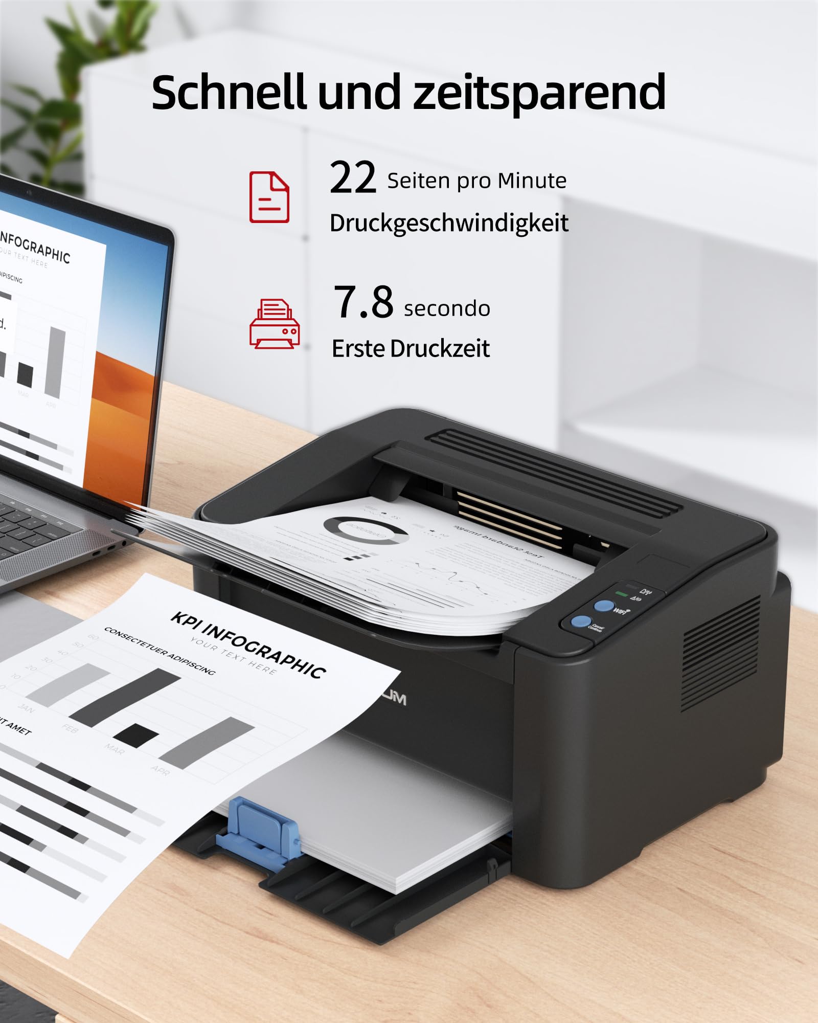 - Hohe Druckgeschwindigkeit: Erledigt Druckaufträge zügig mit einer Geschwindigkeit von bis zu 22 Seiten pro Minute.