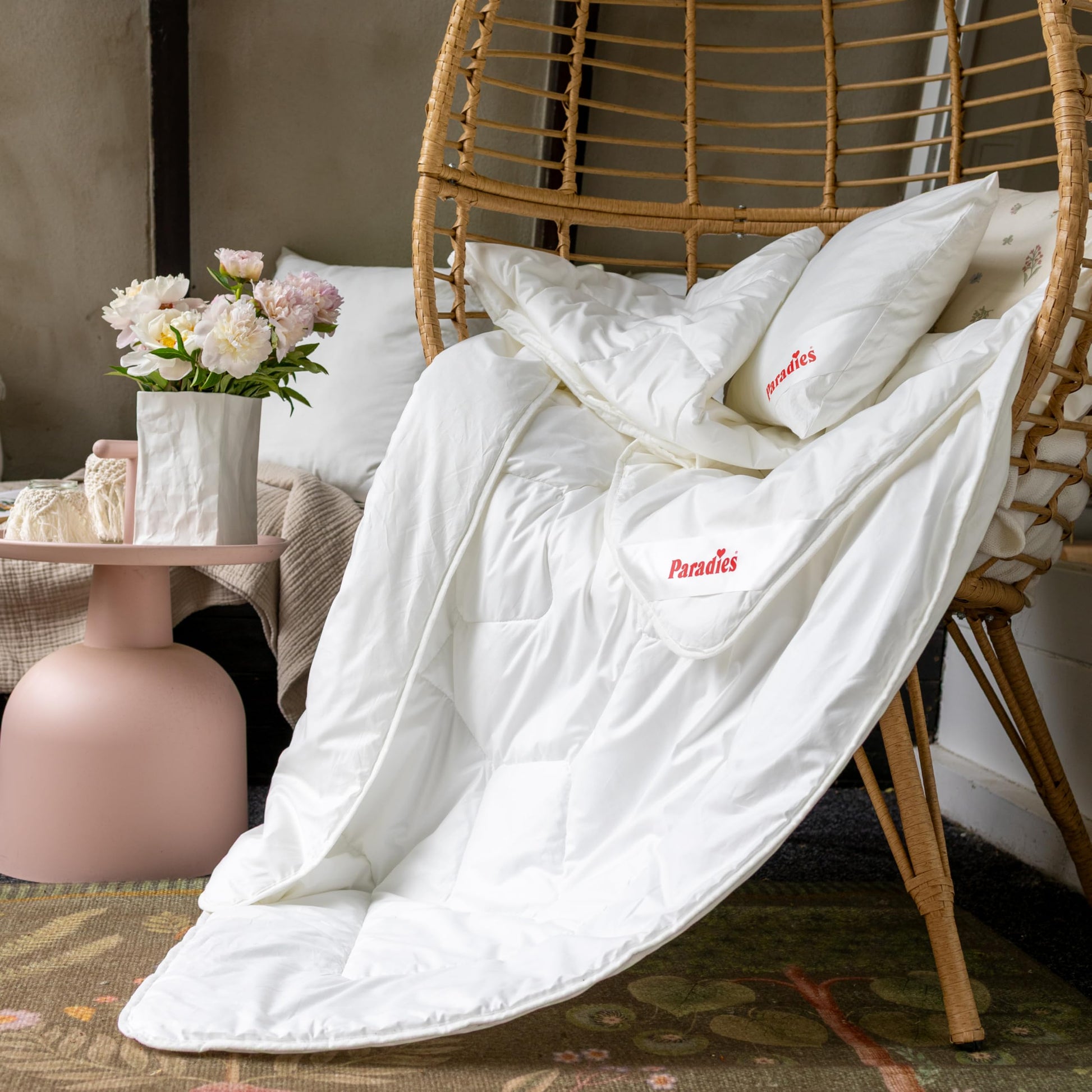 Die Paradies Fill Textilfaser-Füllung bietet ein dauerhaftes, bauschiges Volumen und ist besonders pflegeleicht (waschbar bei 60°C). Im Gegensatz zu Daunen ist sie eine bewusste Wahl für die Umwelt, da sie teilweise aus recycelten Materialien besteht und zudem ideal für Allergiker geeignet ist.